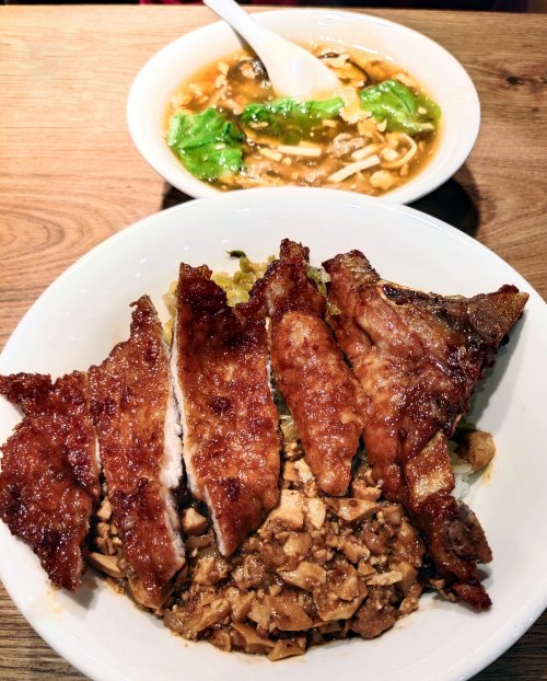 ▼帶骨豬排飯(中),其實也就是傳說中的黑殿排骨飯,一旁搭配的是大滷湯,好像也是不少人必點的組合,哈~