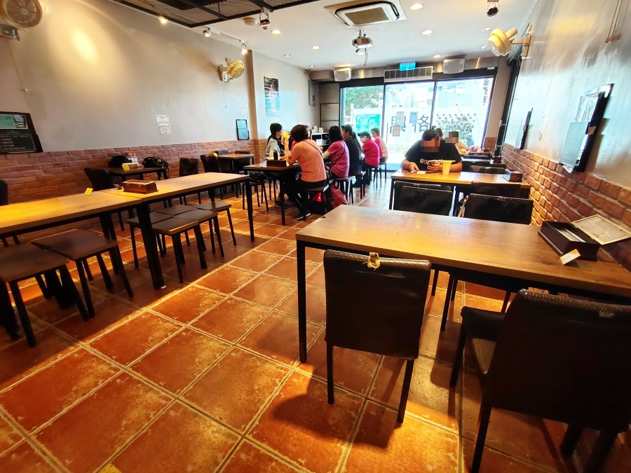 ▼內用區座位還不少,採用白牆磚瓦搭配紅地板營造出懷舊的感覺~我們是選在面對櫃台右邊這一區,冷氣還算涼,桌距也不會太近!