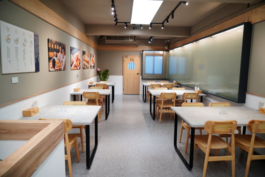 ▼一樓用餐區,利用鐵窗花、磚瓦、海棠花玻璃、藤編等四大元素營造出時尚的空間感,搭配木紋色系,讓整體更增添溫馨感!後方的品牌牆不僅復古又好拍,上頭LOGO還是採用窗花結合”和林”二字,傳達出”和您”一起吃麵的相聚情感,讓拌麵更增添不少溫度~