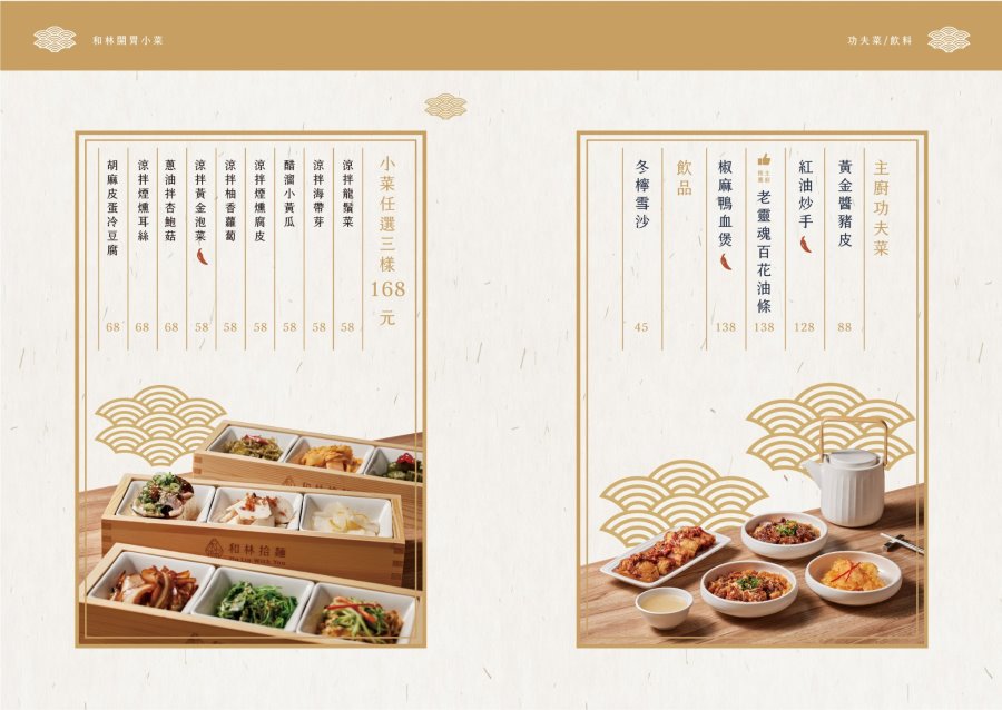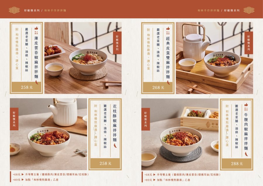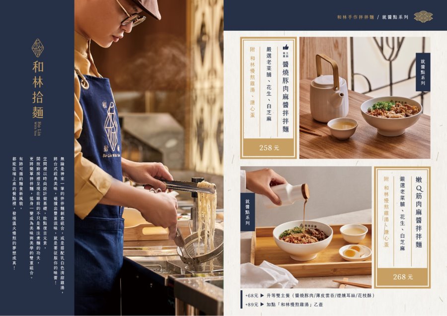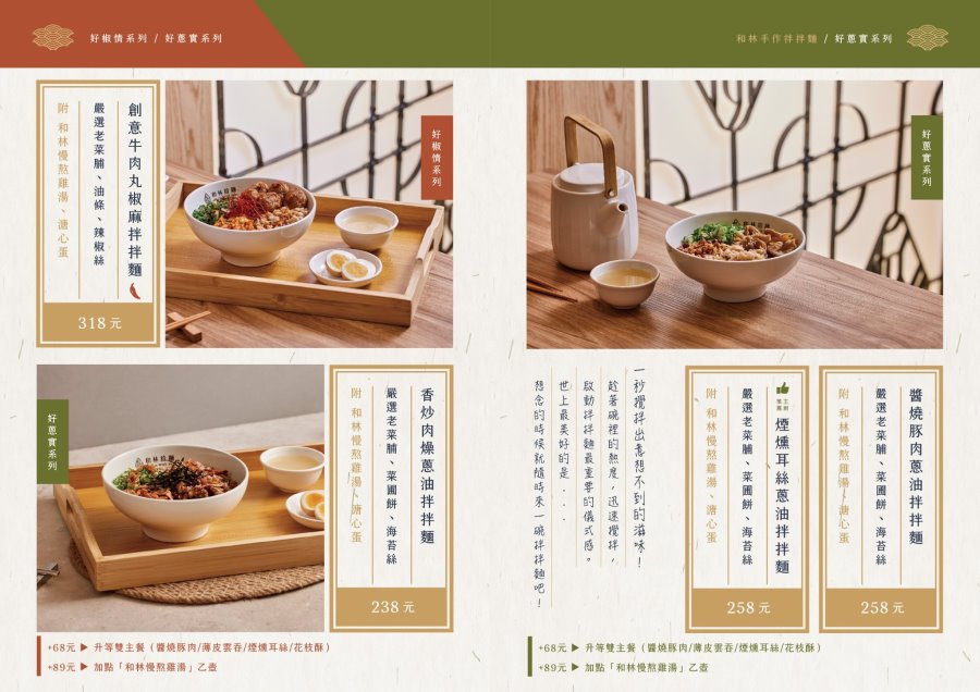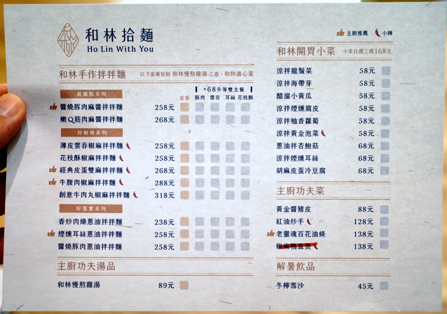 ▼點單,手作拌拌麵價位約落在238~318元之間,這裡採用半自助式用餐方式,所以不收服務費~胃口好或選擇困難的朋友還可以加價68元升級雙主餐,還有豚肉、雲吞、耳絲、花枝酥等五種選擇,吃起來超有飽足感;另外還有開胃小菜、功夫菜、飲品可供選購,很適合搭配餐點享用!