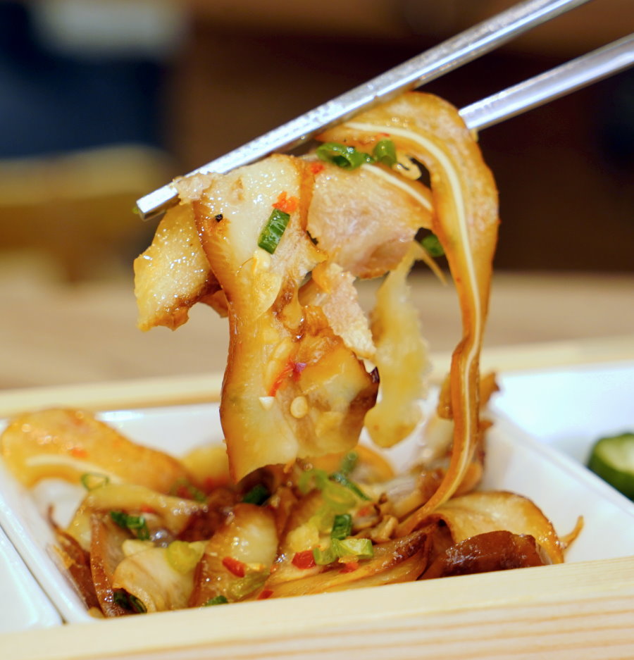▼涼拌煙燻耳絲,耳絲也就是豬耳朵,帶有微微鹹香的煙燻香氣,柔軟中又帶點微脆口感,偶爾還會吃到迷人的膠質,微黏軟Q的味蕾很討喜!