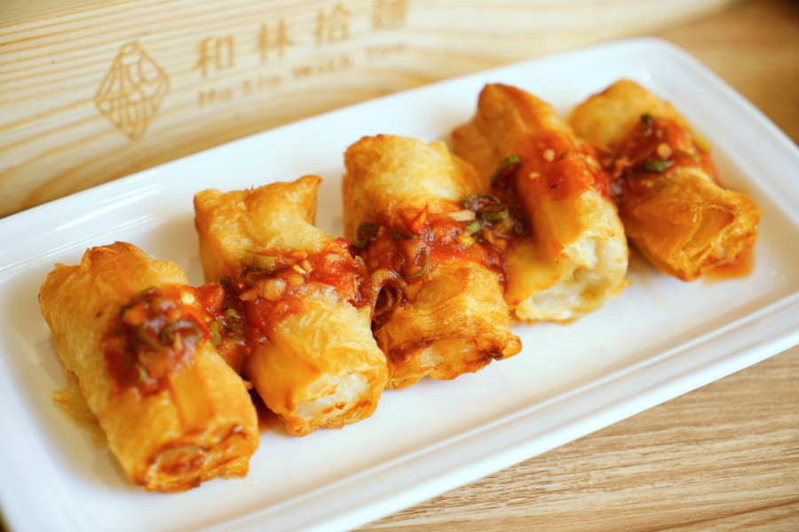 ▼老靈魂百花油條,這道通常在粵菜餐廳比較常見到,沒想到在這裡也能享用得到~採用花枝漿連同蝦仁一起包裹進油條再下去酥炸而成,上頭再淋上特製酸甜醬!