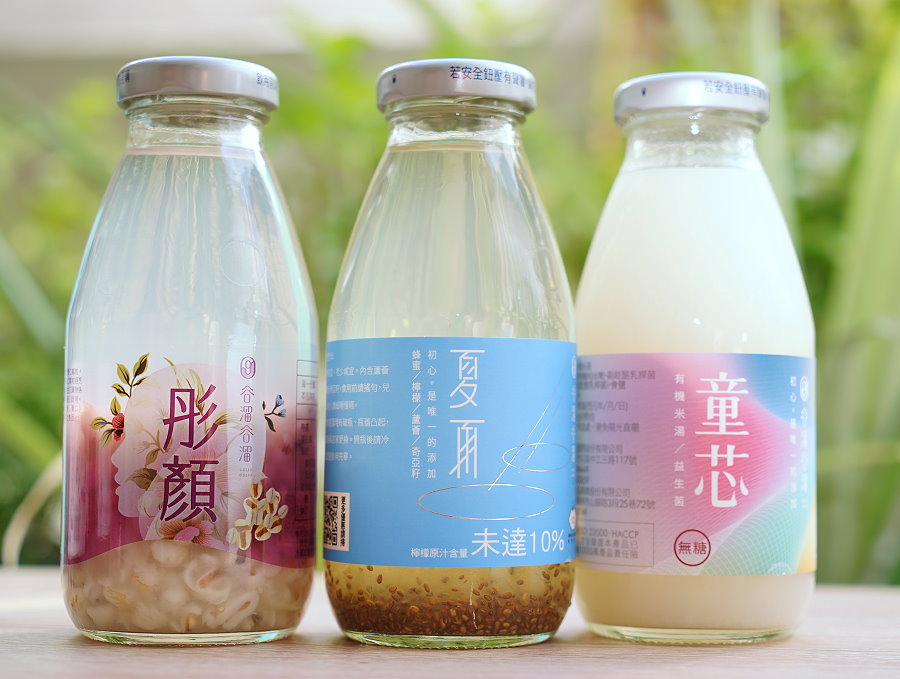 ▼「谷溜谷溜幸福養生飲品」目前有八種口味,分別是井裡月(銀耳露)、黑瓊露(黑木耳露)、紫相思(紫米紅豆湯)、彤顏(薏仁露)、裸心(桂圓紅棗飲)、五谷登科(堅果飲)、夏雨(蜂蜜檸檬蘆薈奇亞籽)、童芯(益生菌有機米湯)等,不僅嚴選物料,採用天然的食材下去製成,沒有人工添加物,做出一瓶瓶幸福又養生的飲品!