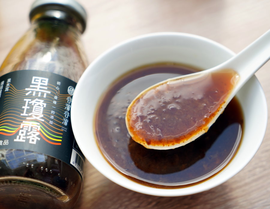 ▼黑瓊露,也就是黑木耳露,採用台灣新鮮黑木耳、台南東山燻焙櫃員、花蓮小農健康日記三色薑黃(綠薑黃、秋鬱金紅薑黃、春薑黃)及少許紅冰糖熬煮而成,費時又費工,才能將黑木耳的精華通通濃縮在這一瓶裡!