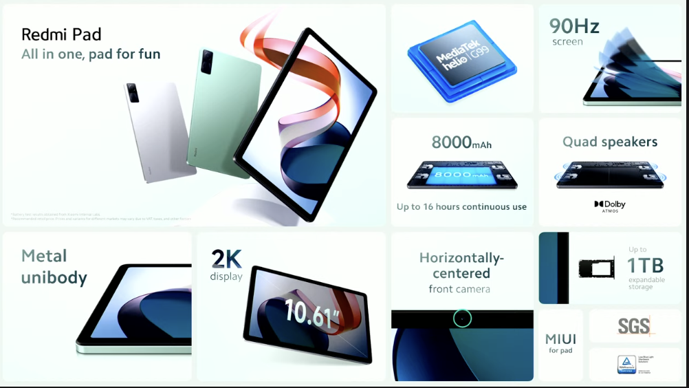 Redmi Pad 有著 10.61 吋 2,000 x 1,200 pixels 解析度 IPS LCD 螢幕、90Hz 螢幕更新率、聯發科 Helio G99 處理器、8,000mAh 電池,4GB + 128GB 版本;支援 USB Type-C、18W 快充技術。