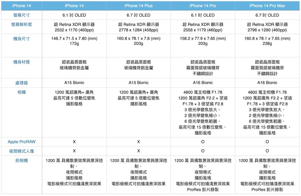 相較於 iPhone 13 系列,iPhone 14 Plus 除了有著紫色與藍色新色以及 6.7 吋大螢幕體驗,還搭載了 5 核心的 A15 處理器、加入自動對焦的前置相機、車禍偵測 SOS ,錄影更是能支援 4K 的電影級模式與動作模式。