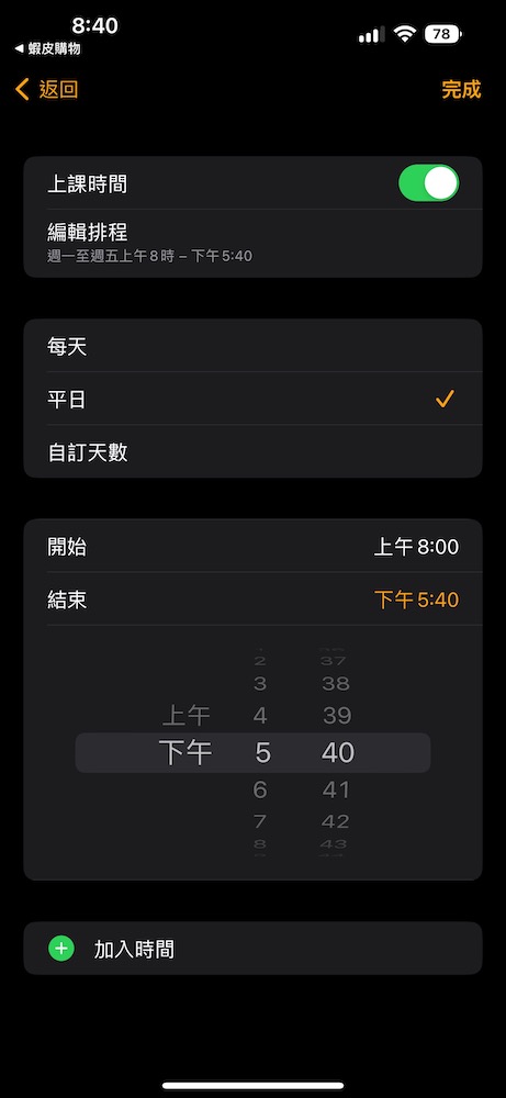 選擇想在哪幾天啟用「上課時間」和時間。