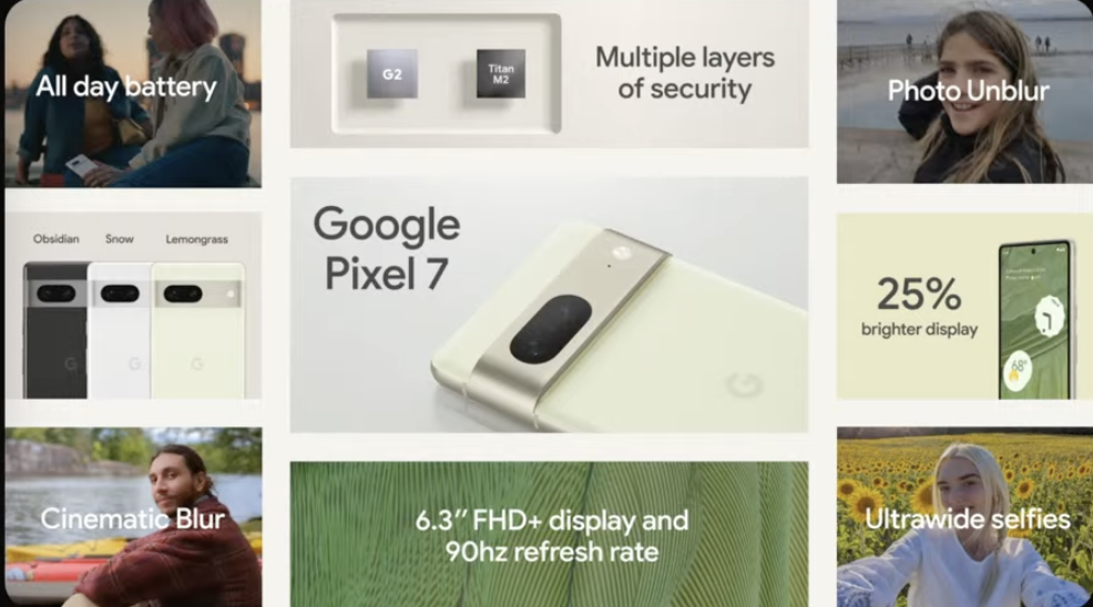 規格上 Pixel 7 為 6.3 吋 FHD+ (1080 x 2400) OLED (416 ppi) 螢幕、4355 mAh 電池容量、8GB RAM、128GB/256GB ROM、5,000 萬畫素廣角 + 1,200 萬畫素超廣角組合,1080 萬畫素前置鏡頭。