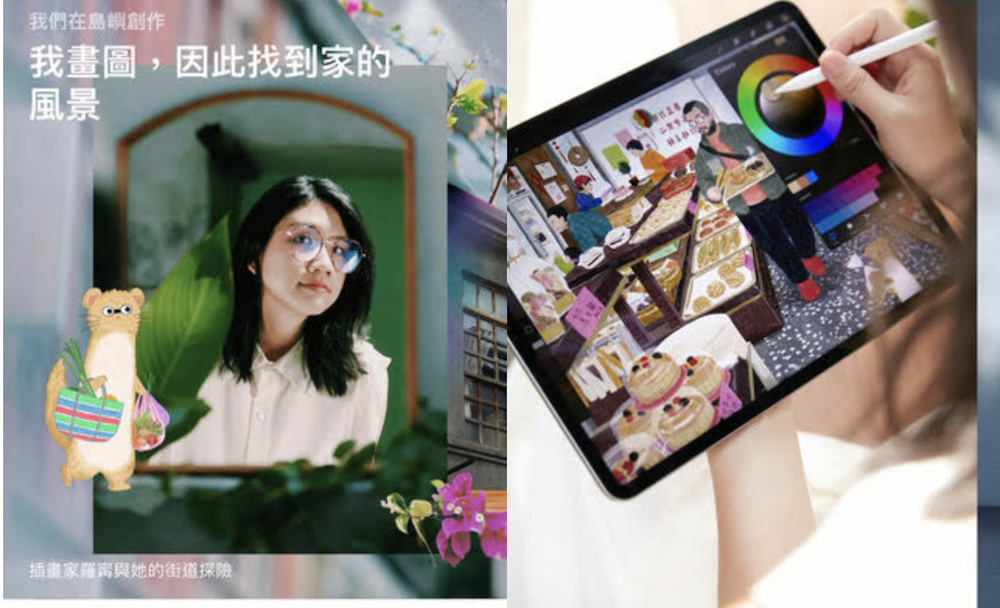 因創作台灣街景故事而為人所知的插畫家羅寗,在海外留學歸國後更有感家鄉認同的重要性,她將每日步行近 1.5 小時的生活習慣與插畫專業融合,帶著 iPhone 和 iPad 遛狗,就能擷取靈感來源並同時創作,路上的藍色發財車、磨石子地的花色和各式字型圖樣的海報,她都能立即坐在路邊用 iPad 和 Procreate 畫下這塊土地的樣子,她說:「我的創作其實是在找尋一種共同記憶,像是我們都有共鳴的顏色。」