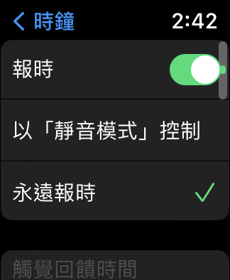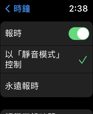 1. 打開 Apple Watch 上的「設定」app ,選擇「時鐘」後開啟「報時」。