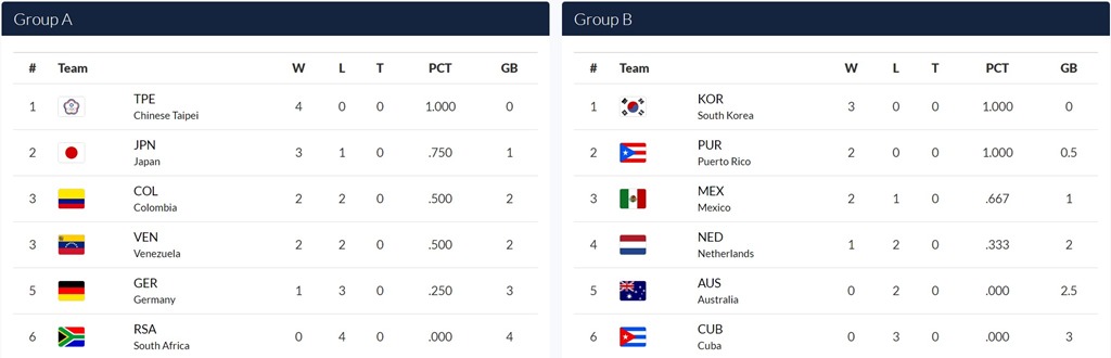 分組賽為 A、B 兩組進行循環賽,A 組為台灣、日本、哥倫比亞、德國、南非、委內瑞拉;B 組為韓國、澳洲、古巴、墨西哥、尼德蘭與波多黎各。