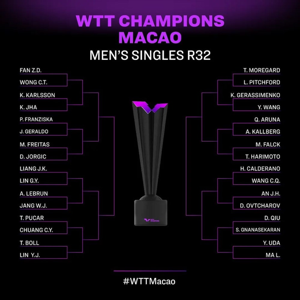世界桌球職業大聯盟 (WTT) 澳門冠軍賽僅設單打項目,男、女單各 32 籤,台灣共有 4 名選手參賽,包括林昀儒、莊智淵、陳思羽、鄭怡靜,並將於 19 日起開賽,臺灣可透過愛爾達體育 1 台轉播。