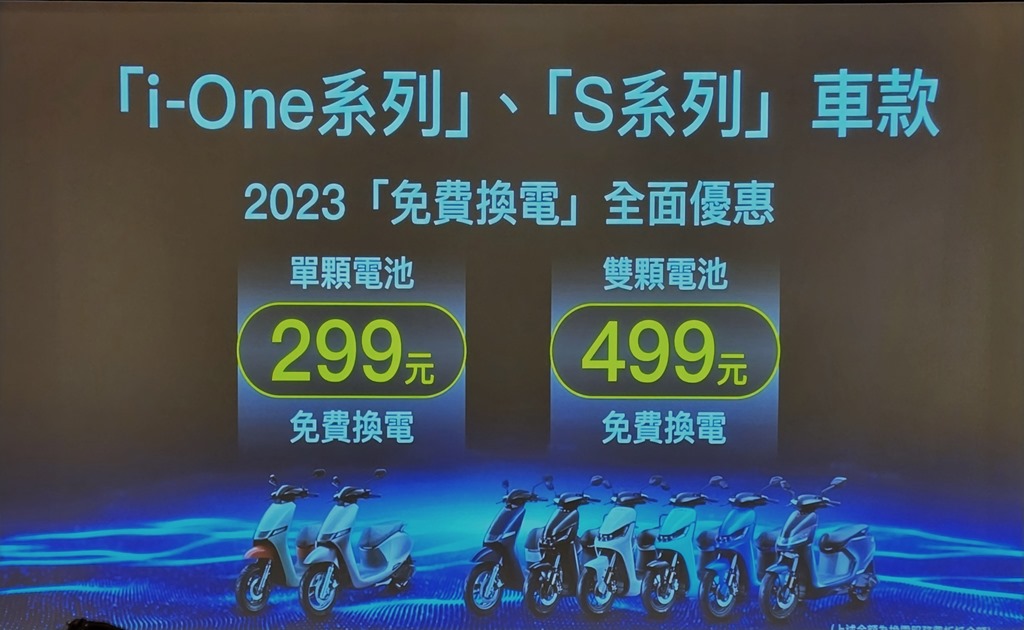 在換電資費方案部分,2023 年同樣有著換電免費優惠,提供給 299 單電池與 499 雙電池免費換電優惠,單顆電池車型 299 元如單月里程不超過 303 公里(130安時)、雙電池車型 499 元每個月不超過 439 公里(300安時),就等於完全不用月租費。
