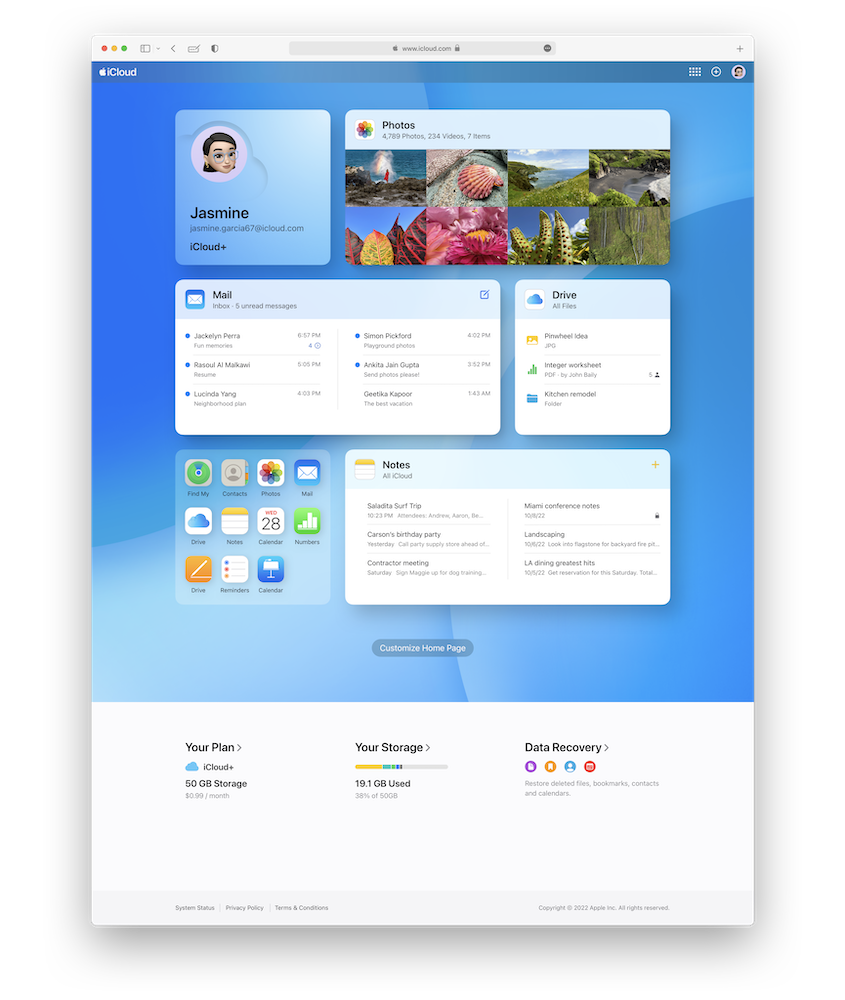 新的 iCloud Web 版同樣能夠在 Mac、iOS、iPadOS 裝置和 iCloud.com 上使用,全新設計的 iCloud.com 從今天開始提供 beta 預覽,讓使用者可以客製化首頁,更容易找到最近使用的內容以提供更個人化的體驗;讓只有 iPhone 的使用者,也能在像是 Windows PC 等非 Apple 設備上,輕鬆在網頁上存取 iCloud 裡的資料。 除此之外,使用者可以在上面找到關於 iCloud+ 的相關資訊,「隱藏我的電子郵件」等 iCloud+ 功能也能在網頁上使用。