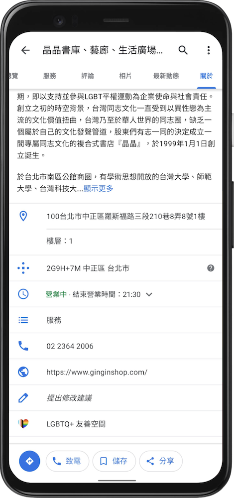 另外,Google 也持續協助中小微型企業和 LGBTQ+ 社群建立連結。例如,在 Google 地圖上搜尋「LGBTQ+ 友善」,就可以找到對性別認同更包容的商家和餐廳;無論今年要如何慶祝同志遊行,記得找到這樣的店家,留下評論、分享照片表示支持,同時鼓勵來自其他城市的旅客下次可以造訪。當然,如果是包容多元性別的業者、經營跨性別友善的空間,或是有提供性別友善的廁所,也能夠在 Google 地圖「商家檔案」上面的「屬性」選項標記,讓更多人可以找到最自在的消費環境。