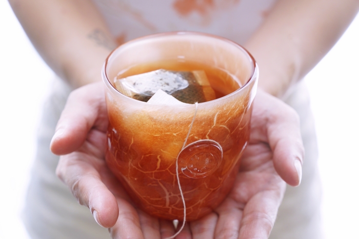 雖然這款杯子沒有把手,但是手工製作,不規則凹凸的杯身,也易於握拿,杯身特別製作了煉功屋 logo 浮印,方便掛上茶包。
