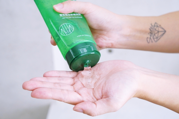 蘆薈曬後舒緩凝膠成分有新鮮蘆薈原萃、胡椒根萃取液、維他命 B5 等,可按照平時保養需求,薄擦、厚敷、搭配面膜一起敷都可以。