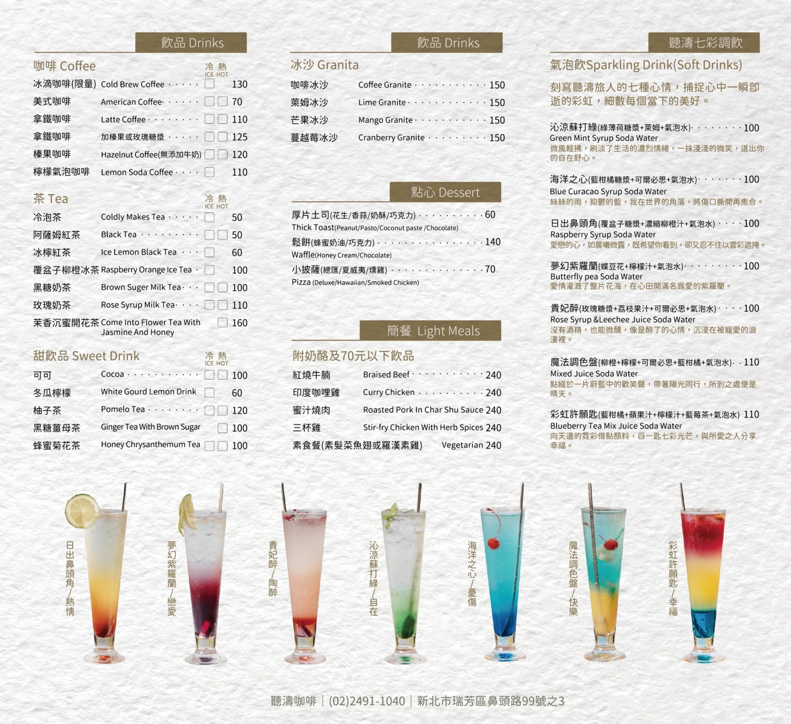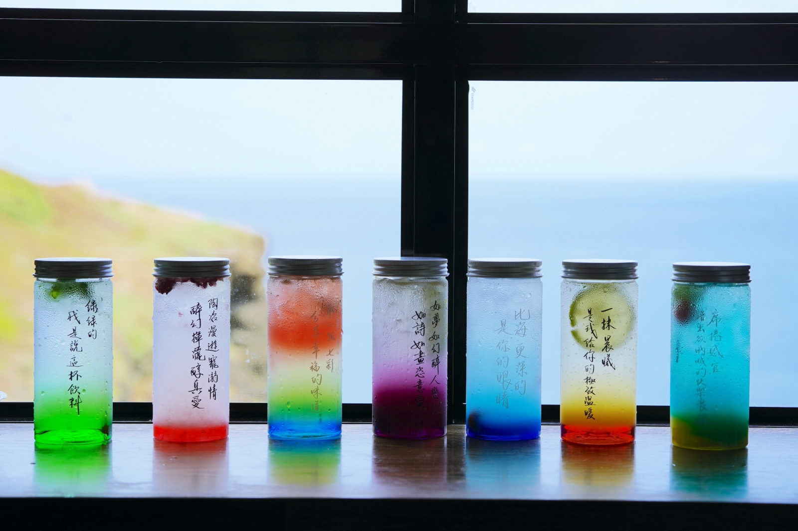 ▼「聽濤cafe x 七彩調飲」七彩的繽紛色彩代表著熱情、戀愛、陶醉、自在、憂傷、快樂、幸福,各自代表來到聽濤看海的心境,這些「聽濤語錄」,是向廣大粉絲徵文後,經由精心挑選脫穎而出的創作。