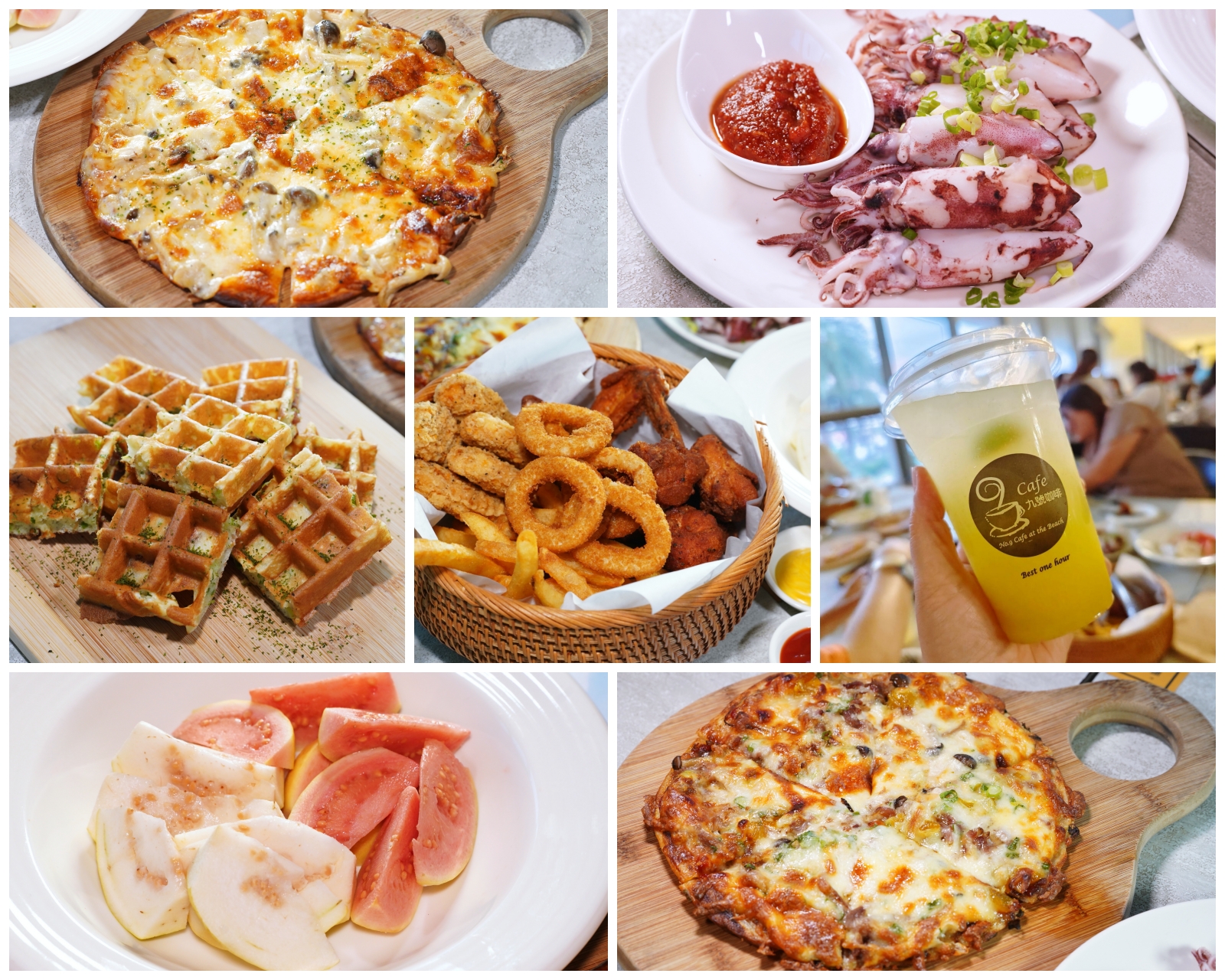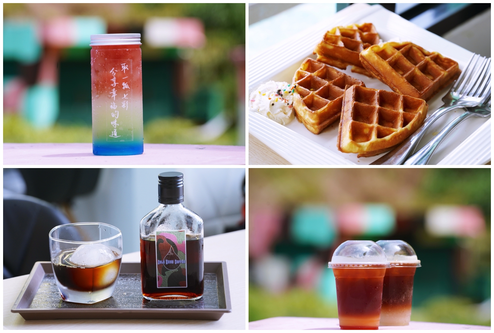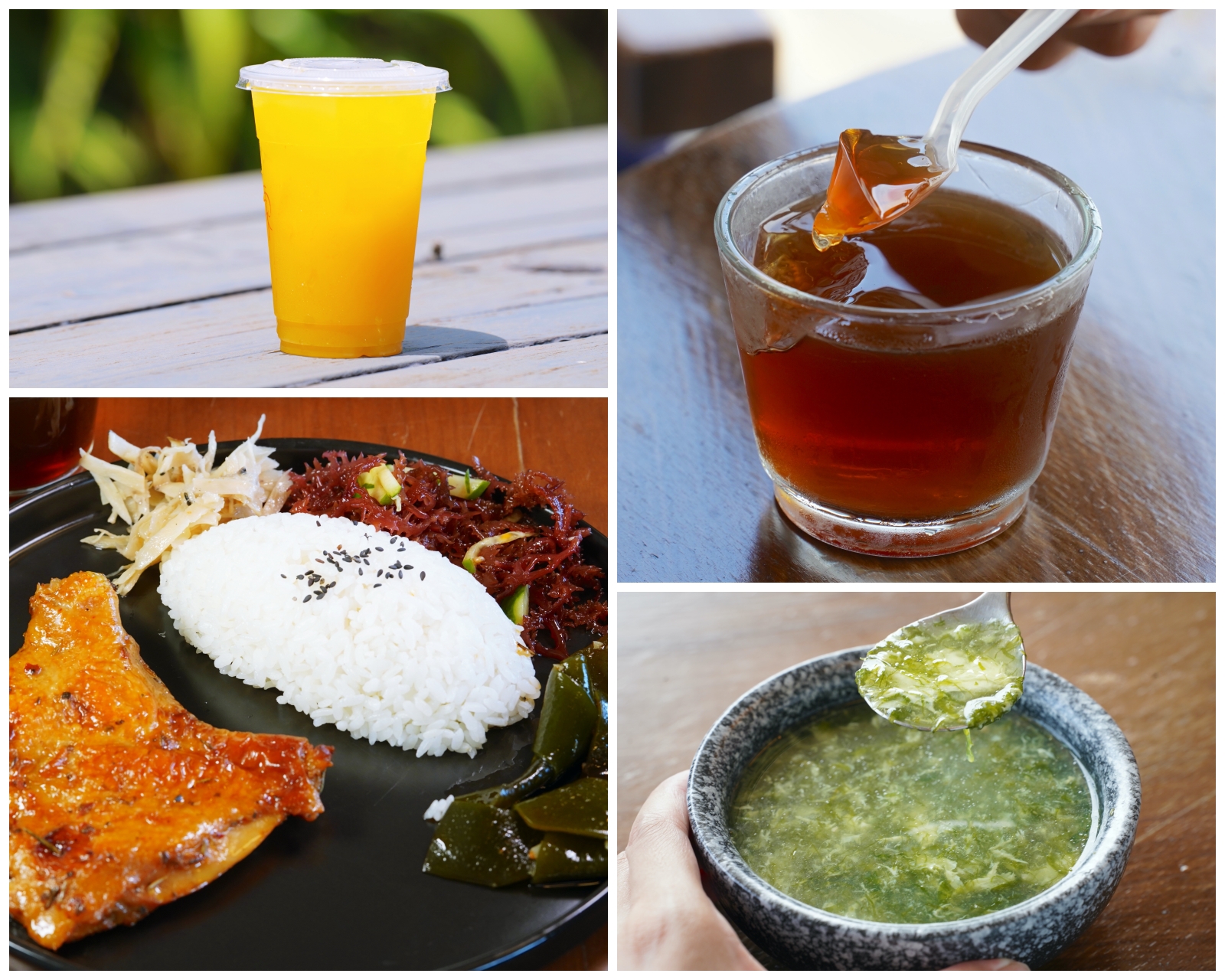 ▼咖啡廳飲品價格 70-150,套餐 280 包括主餐、70元飲料、石花凍飲、海藻蛋花湯,套餐划算很多。餐點就地取材採用海藻、石花,東北角採收的棒青海苔,製作石花菜凍、海藻鬆餅、棒青海苔蛋花湯、涼拌長壽菜、麒麟菜,都是清爽路線,在經過戶外烈日下的行程後,特別能喚醒食慾。