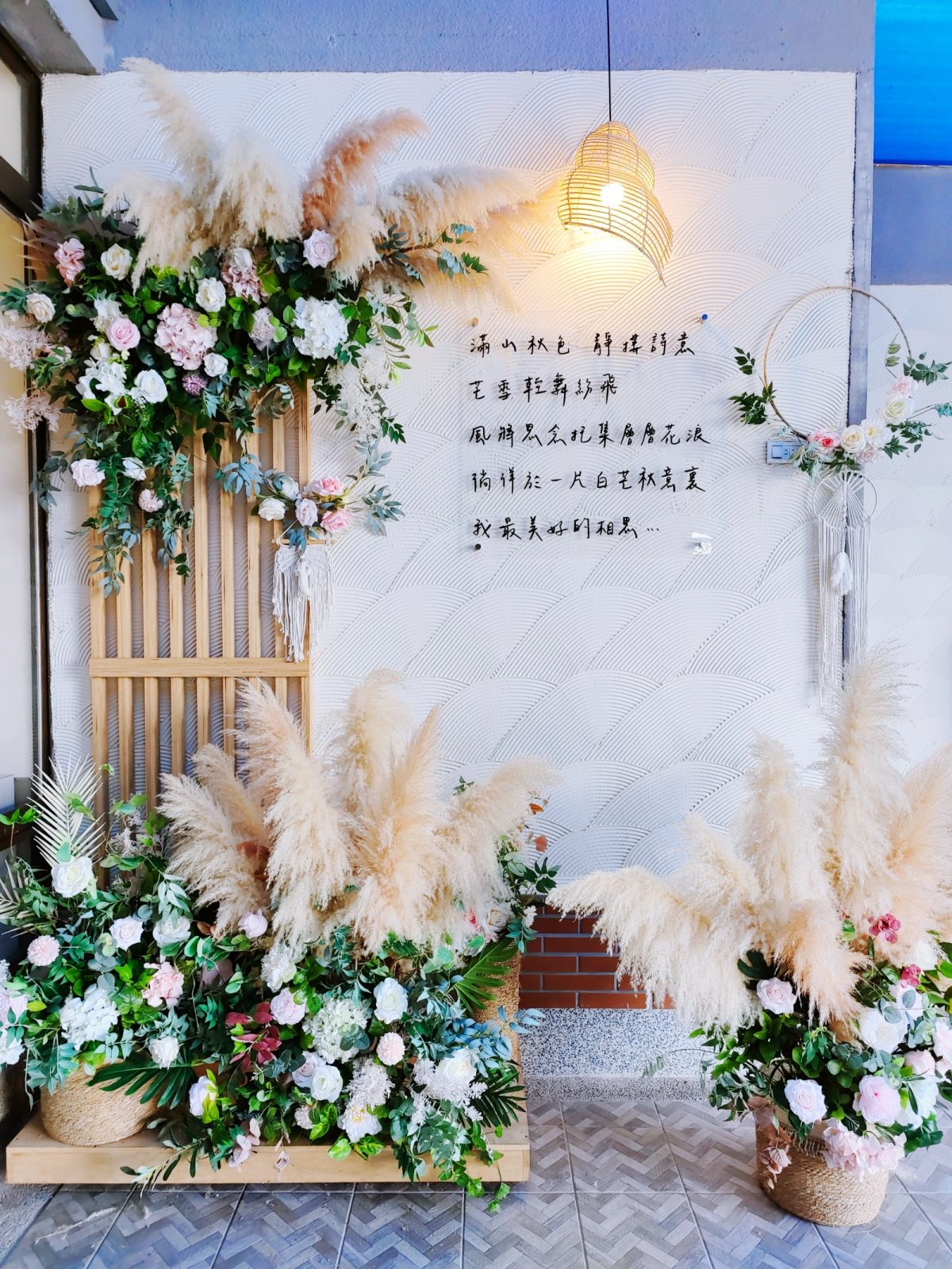 ▼店外設有網美打卡牆,可不是隨便裝飾,是用永生花設計,用芒花裝飾,一看就懂是代表草嶺古道意象。