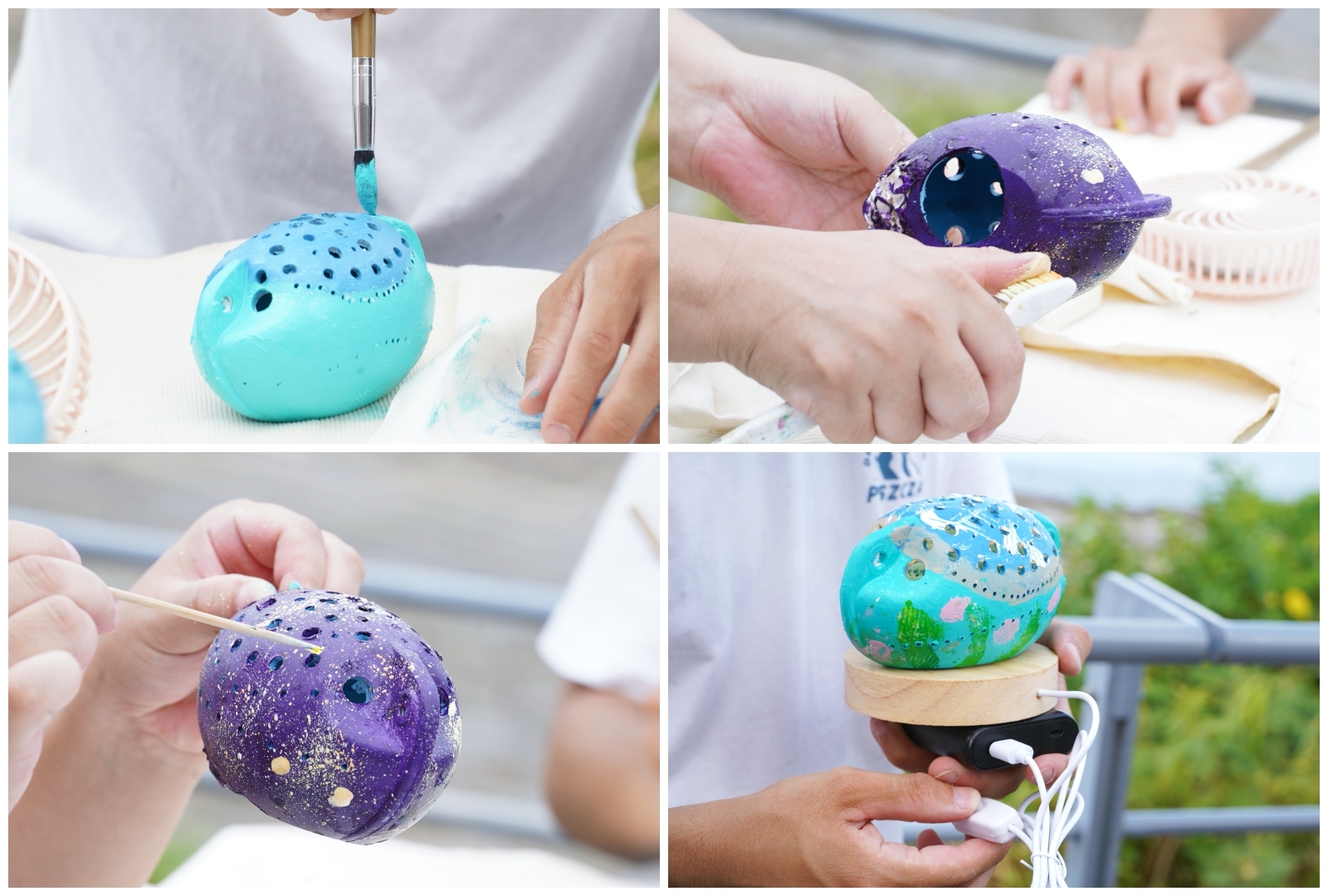 ▼一開始顏料一定要塗均勻,因為會影響後續加工花色的美觀程度。彩繪完畢後,用吹風機吹乾、領取燈座後就可以帶回家裝飾囉!除了彩繪,星空X藝素村會帶著孩子們一起淨灘,創造不同於走馬看花、並促使人們反思的旅行體驗,往後都能適度、適量的使用資源,不浪費、不過度消耗,徹底落實在生活中。
