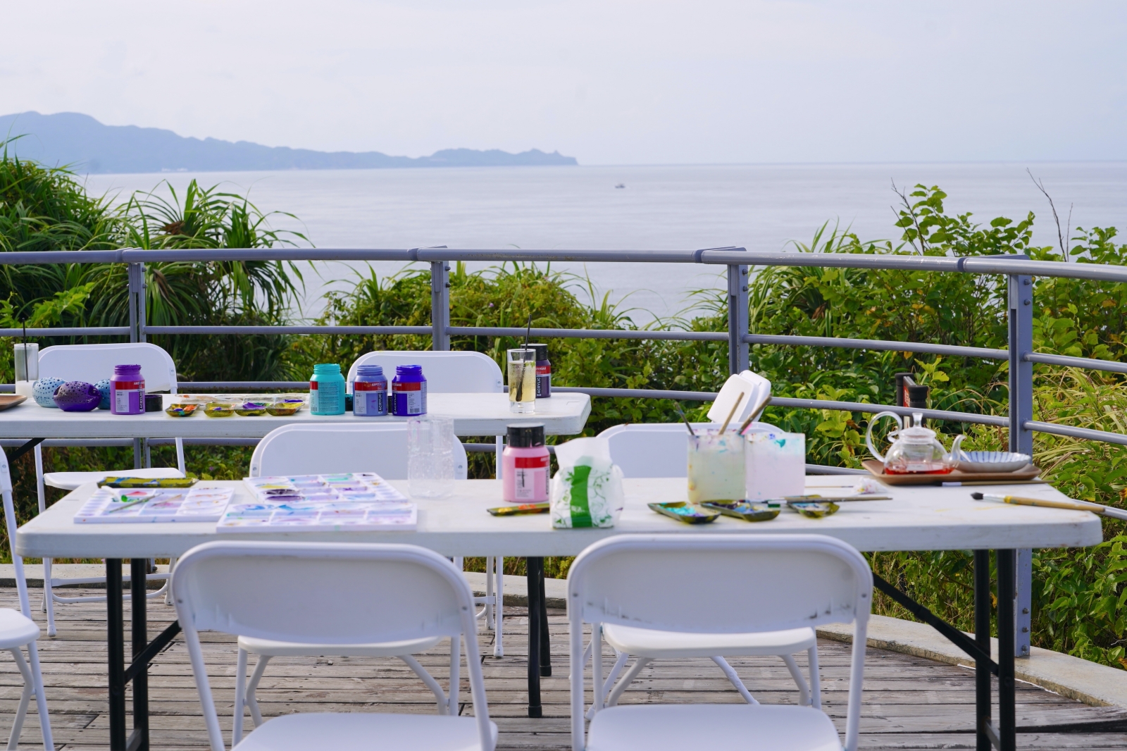 ▼店外有觀海平台,但是來看海也不是我們此行重點,我們要在這裡做彩繪浮球小夜燈體驗。平常的時候,這處觀海是仰望天空、看著大海、潮間帶最好的位置。