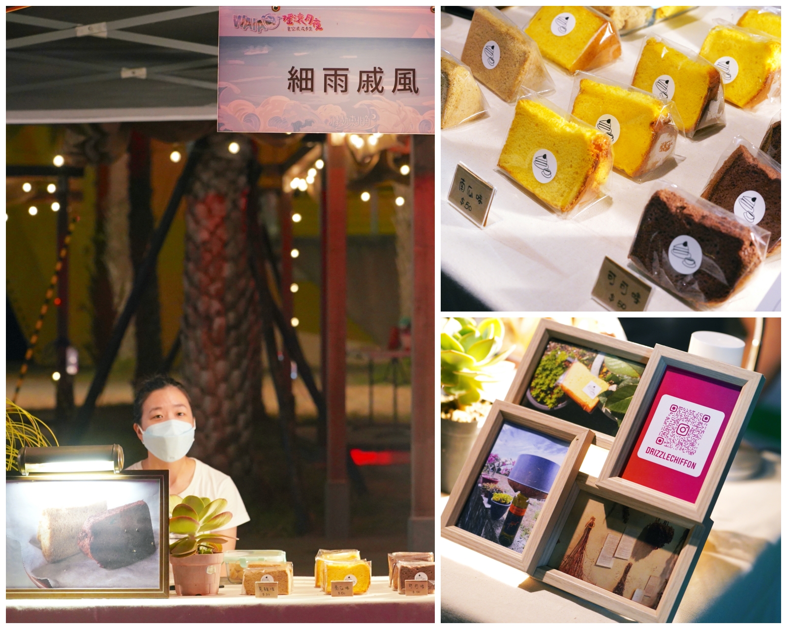 細雨戚風的戚風蛋糕有、法國法芙娜可可、南投名間烏龍茶、宜蘭東洋南瓜口味,南瓜是由老闆親戚種植收成的南瓜製作。老闆與老闆家人最喜歡的是可可口味,所以在市集展售時,一定會展售這款。