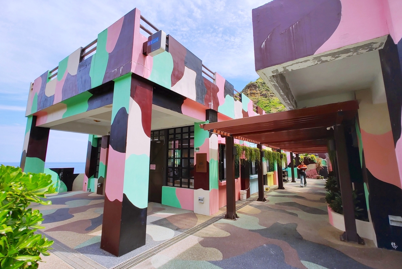 ▼外觀的迷彩風格用綠色搭配粉色,並且用植栽襯托,潤飾掉剛烈軍事化色彩,也融入整個依山傍海的山海景觀。