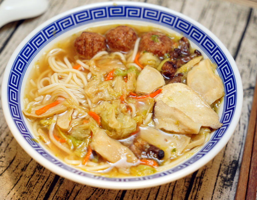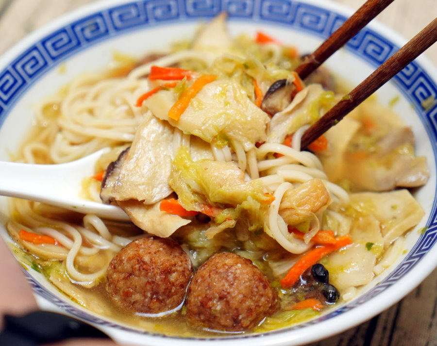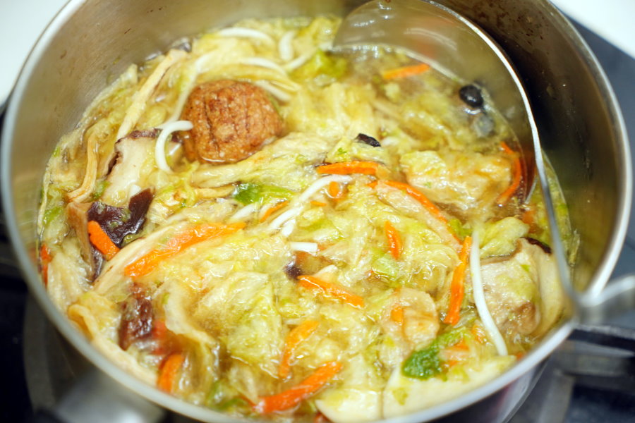 ▼湯頭喝起來鹹香甘醇又爽口,搭配多種蔬菜、菇類,吃起來甘甜順口、爽度極高,加上麵條、植物肉丸更有飽足感,而且輕鬆快速就能上桌,當作正餐或宵夜都可以,真的很方便!