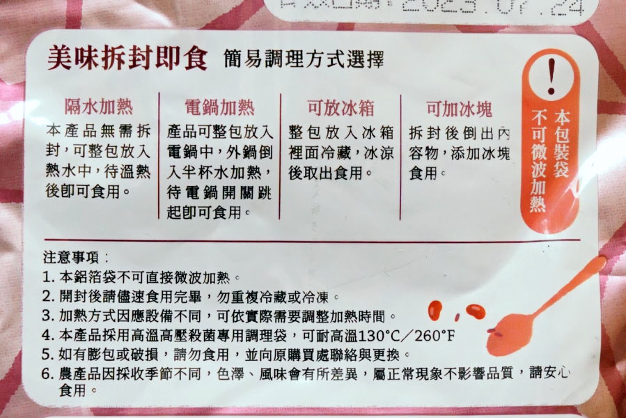 ▼由於這款包裝是採用高溫高壓專用調理袋,所以是可以直接隔水加熱、電鍋加熱,或者是直接整包放入冰箱冷藏,拆封倒出後也可直接加入冰塊,但不可放入微波加熱~還算是挺方便的!