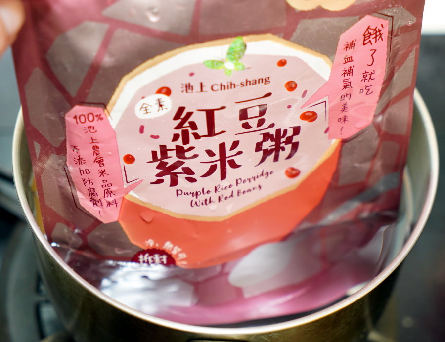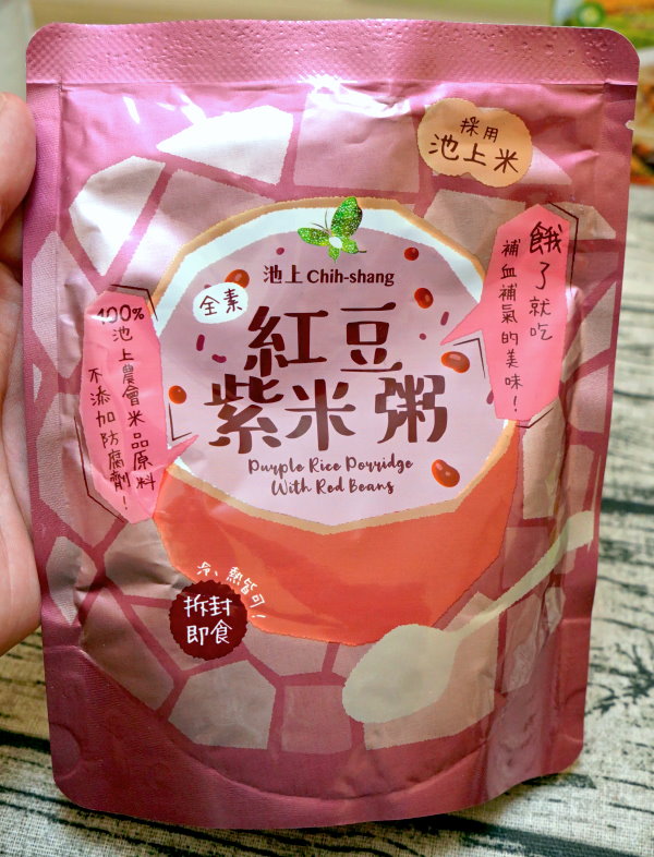 ▼由台東池上鄉農會推出的「紅豆紫米粥」採用臺東池上紫米搭配萬丹紅豆製成,沒有添加防腐劑,開封即食好方便~而且不管是常溫、冷藏或是加熱享用都很棒!