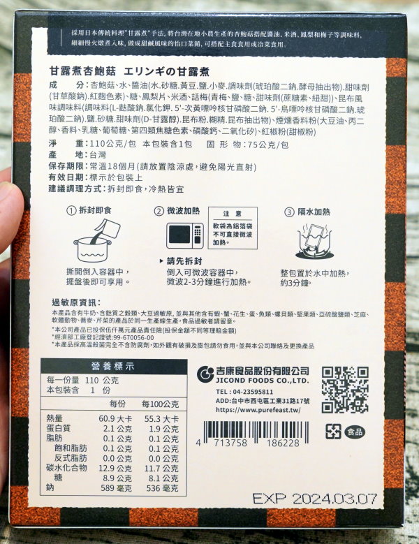 ▼包裝背面也有詳細的食用方式、營養標示、原料與製造商資訊,加熱方式簡單快速,吃起來也很安心!