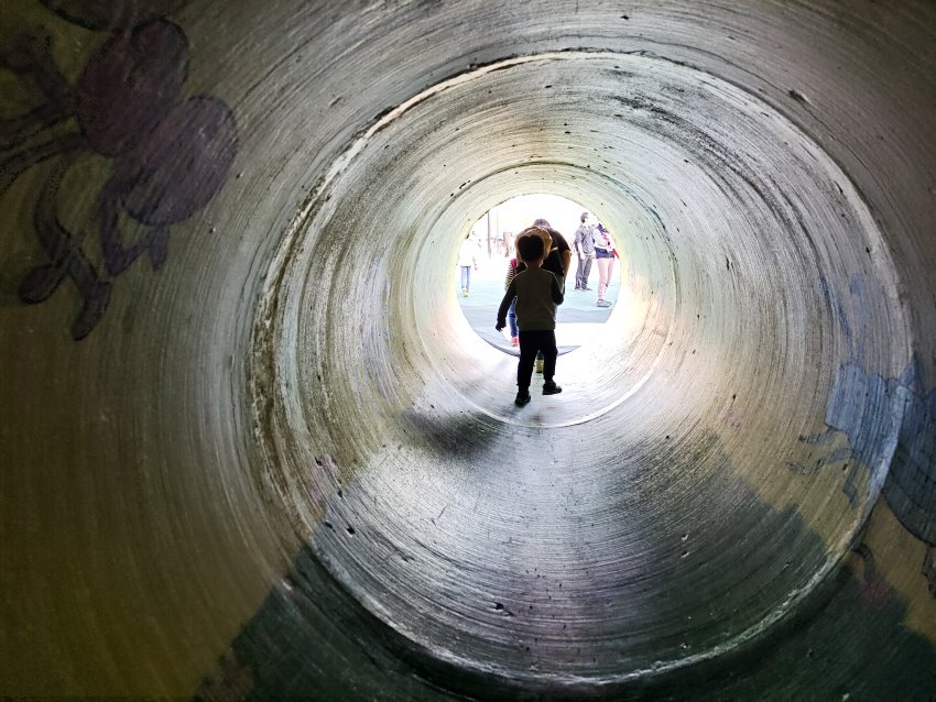 ▼一旁竟然還有秘密通道~也就是水管彩繪隧道,讓小朋友可以穿梭其中,感覺也很促咪,穿過去就是溜滑梯的正面囉~