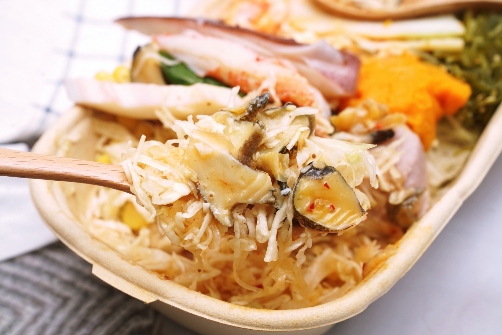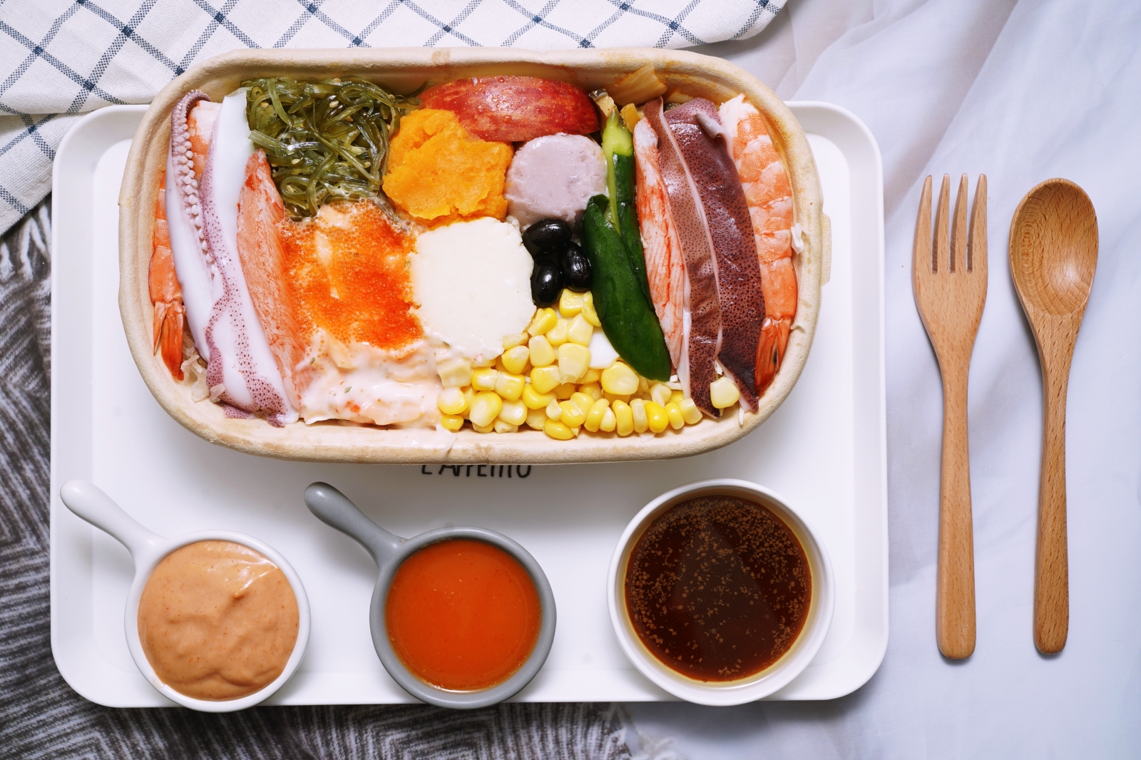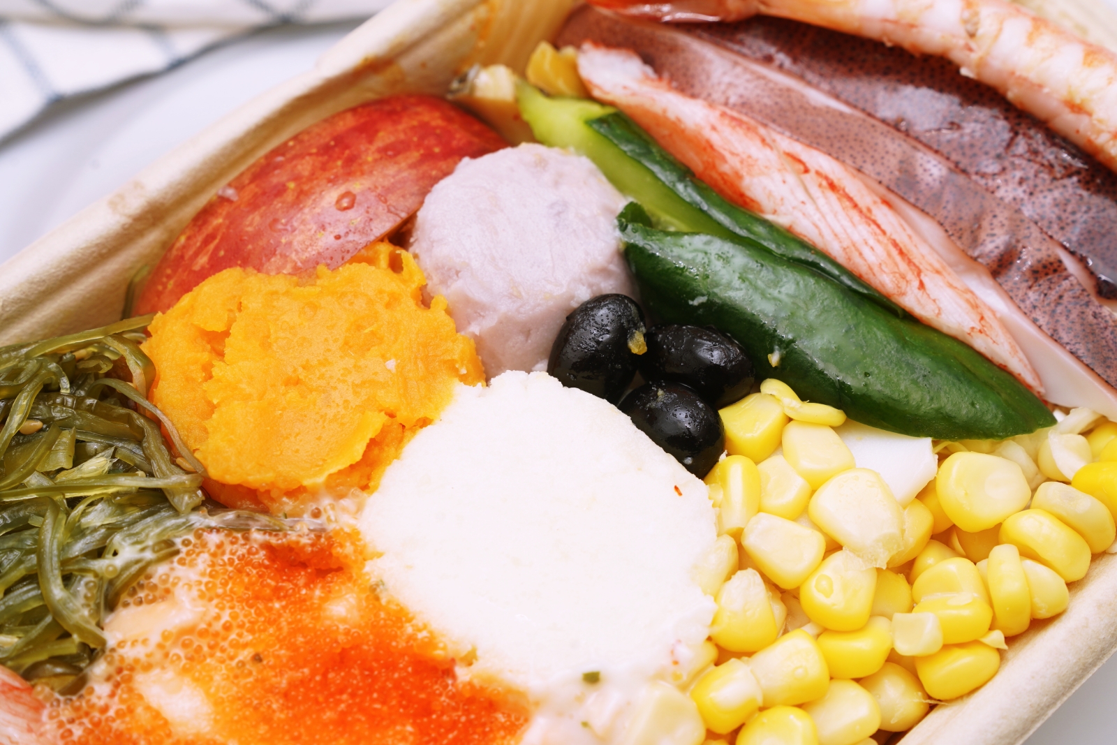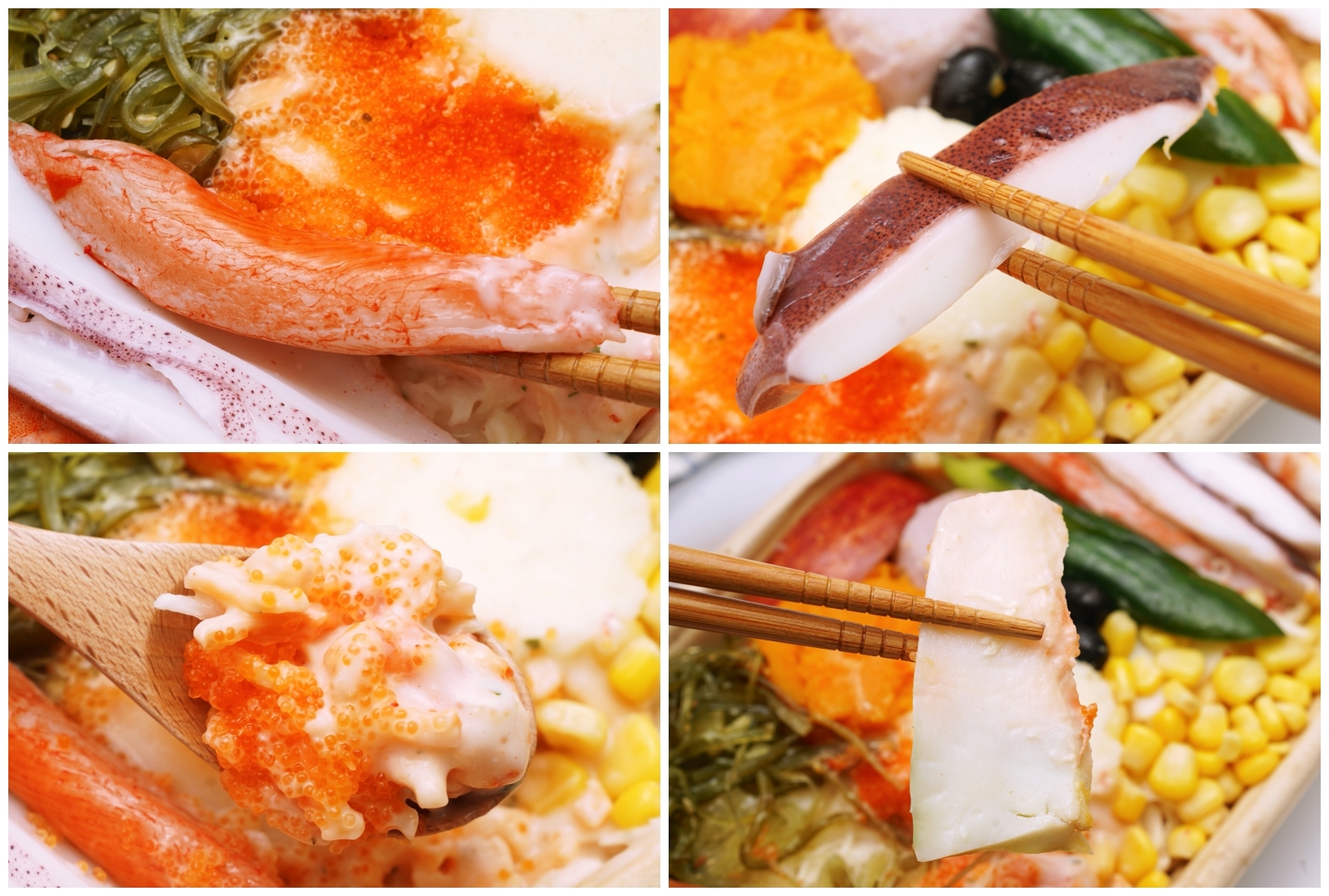 ▼更吸引人的多種新鮮海鮮:綿密鮮甜不鬆散的日本進口蟹棒、軟Q且擁有厚實肉質的 4A 生食級軟絲、與龍蝦沙拉、鮮香的魚卵、軟嫩的貴妃鮑片、貼心去殼的鮮蝦。對於愛海鮮、愛吃菜、薯泥的我,一個人嗑光一整盒太簡單囉!