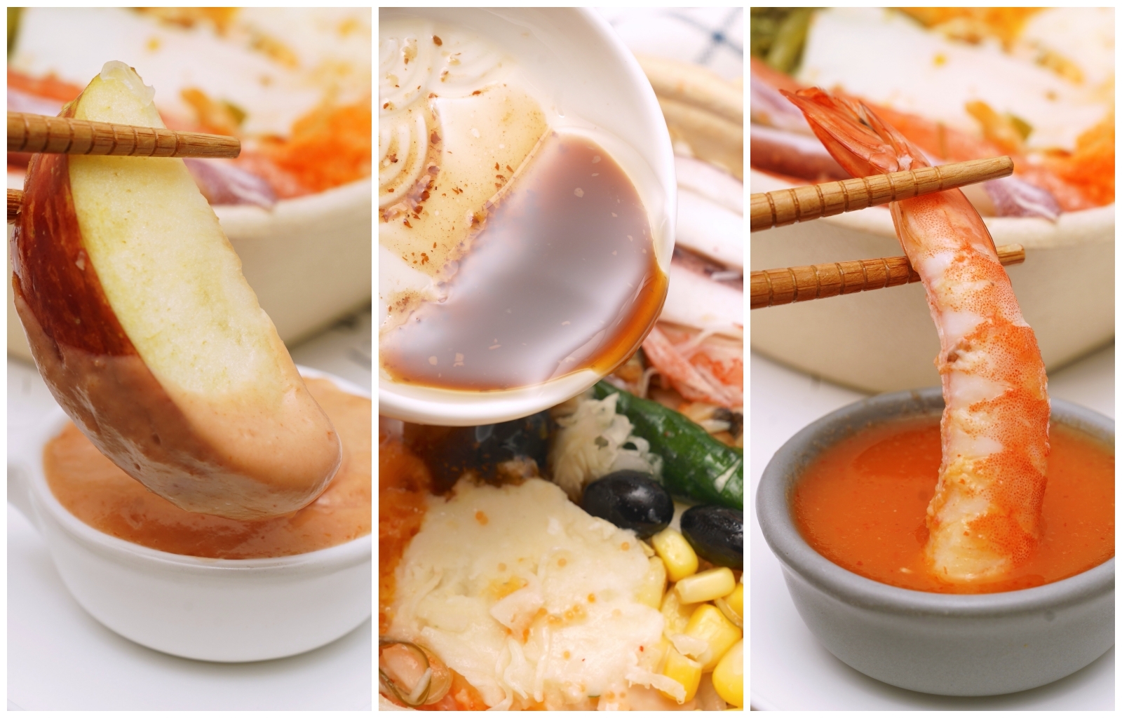 ▼海鮮沙拉搭配多種新鮮蔬果:蘋果、小黃瓜、秋葵、玉米,並且加入馬鈴薯、金山地瓜、大甲芋頭做成的三色薯泥,薯泥柔細鬆軟,點綴之下,顏色配置豐富,更有飽足感。
