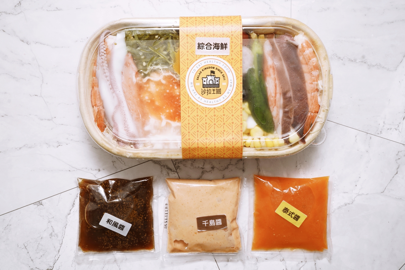 沙拉王國的綜合海鮮沙拉榮獲新北特色商品,也是沙拉王國的人氣商品,老闆很懂客人愛嘗鮮的心理,一次給三種醬料包:和風、千島、泰式醬。