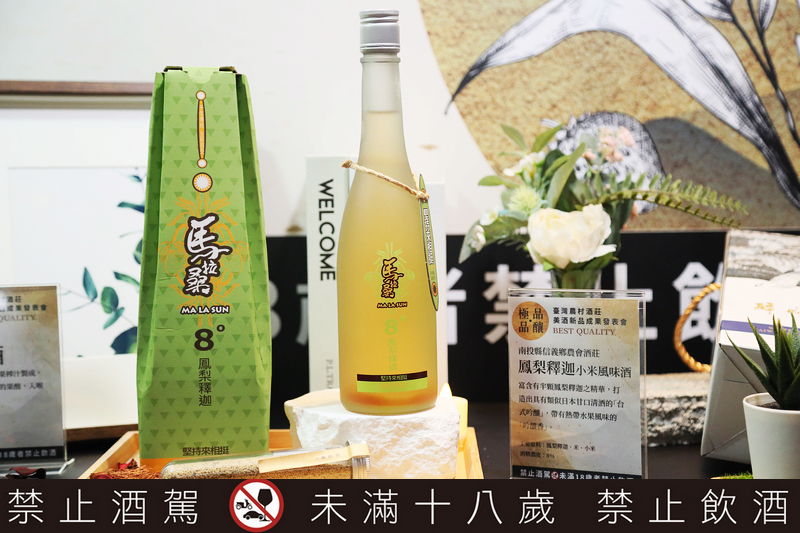 南投縣信義鄉農會酒莊(馬拉桑鳳梨釋迦小米風味酒) 原料:鳳梨釋迦小米等 酒精濃度:8度