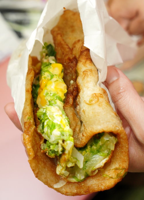 ▼看起來有點類似炸彈蔥油餅的感覺,但比炸彈蔥油餅多了一個煎的動作,吃起來也比較沒這麼油膩~這次我們沒有加辣椒,印象中他們家的辣椒也是自行炒製,香氣很足但辣度也不低,嗜辣的朋友可以考慮,多一股香辣的味蕾也不錯!