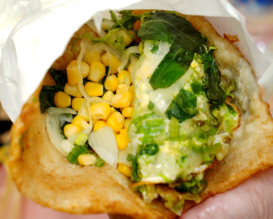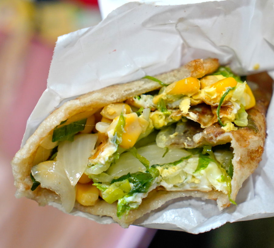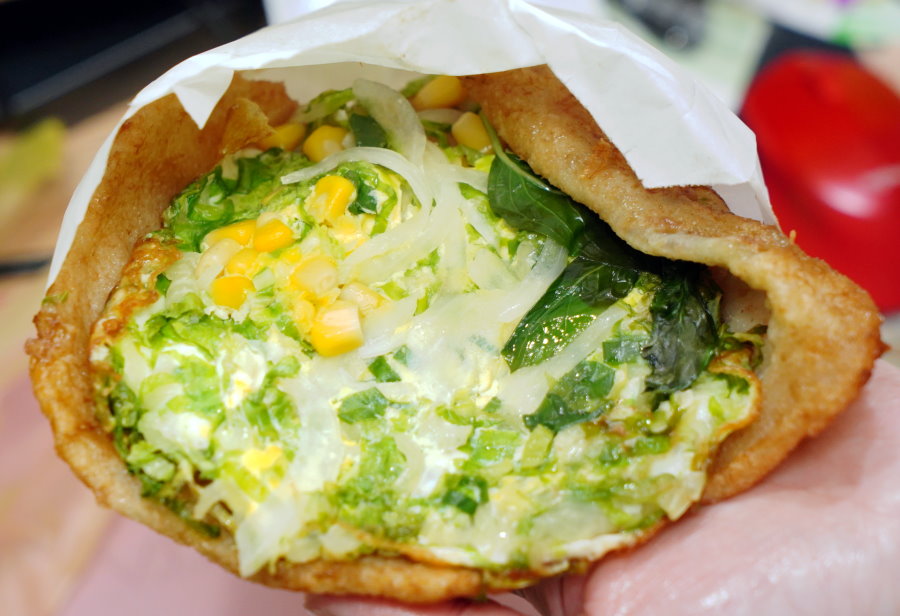 桃園美食「柴氏蔥油餅」就位於桃園區大業路一段上,是熱門的大業寶山黃昏市場美食,主打先炸再煎、不使用回鍋油及有機蛋下去製成,特色就是裡頭放了大量的蔬菜,多到幾乎蓋過蔥油餅的感覺,也是不少公司團購的下午茶好選擇~~老客人都會點綜合+蛋,一次就能品嘗到五種不同蔬菜的美味,吃起來軟Q清甜又不膩,嗜辣的朋友也不要錯過他們家的自製辣椒醬,又香又辣很過癮;另外九層塔+蛋也是很熱門的選項,算是兼具營養與美味的好口味!