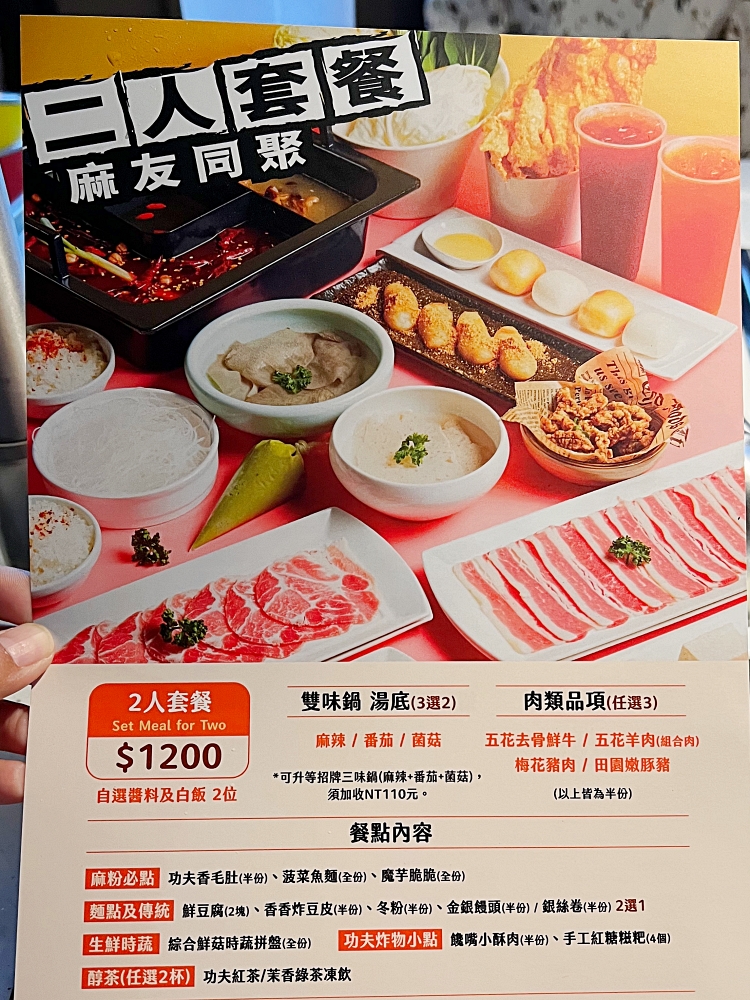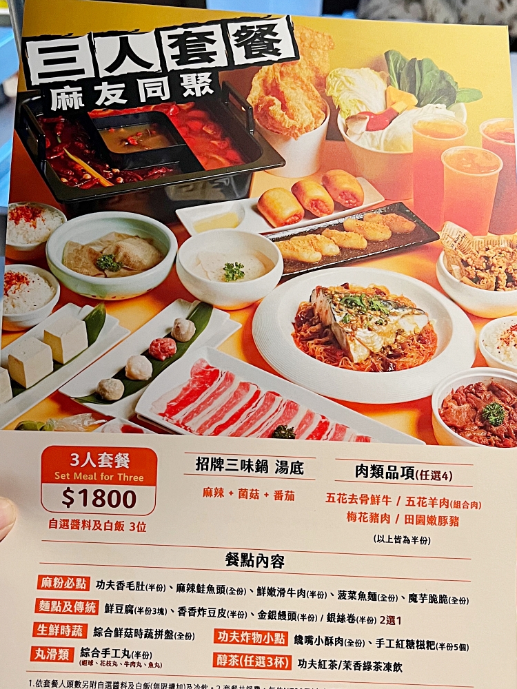 有別於其他常見的麻辣鍋,這裡主推「2人套餐$1200」「3人套餐$1800」不必再揪一群人才能吃,即便是少少的2人也可以享用麻辣鍋大餐。套餐包含的餐點份量跟種類不少,平均每人600元,就可享用14至17道餐點,像是麻粉必吃的毛肚、麻辣鮭魚頭、菠菜魚麵、魔芋脆脆,功夫炸物的小酥肉、手工紅糖糍粑,一次把經典菜色通通吃到。想要單點的話也很人性化,菜色分成半份、全份,依照喜愛點適合的份量。