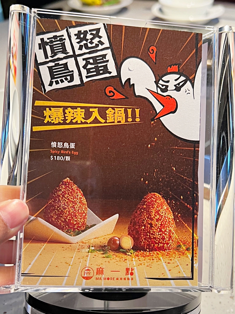 ▲「憤怒鳥蛋$180」可愛度爆表的麻辣鳥蛋,大推!必點!用麻辣牛油塑造成大顆鳥蛋,裡面是好幾顆的滷小鳥蛋,直接入鍋煮香氣奔放。