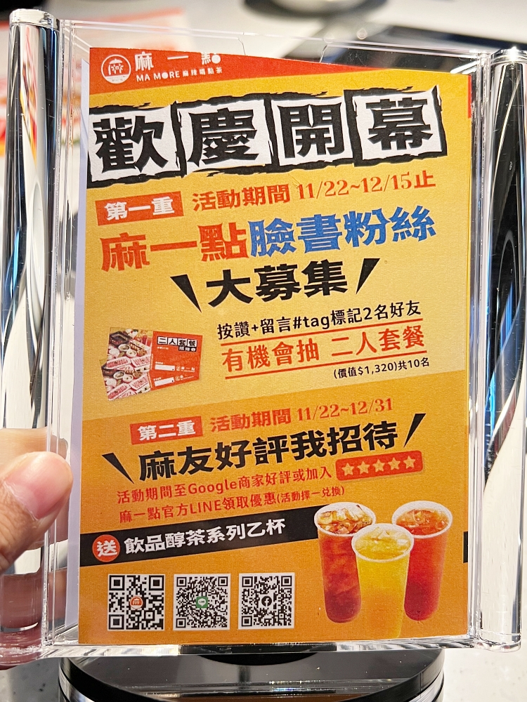 每天上下班都會經過公益路跟精誠路口,忽然間的2-3個禮拜就從原本的塩選燒肉換成「麻一點」,看到布條高高掛起,上面寫著鼎王集團麻一鍋11/22開幕,就立馬決定要吃一波!沒想到才開幕第一天,訂位完全客滿!從一樓到二樓都是滿滿人潮。目前營業時間到凌晨2:00,多了宵夜的好選擇。