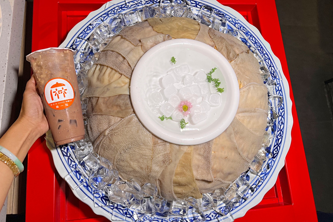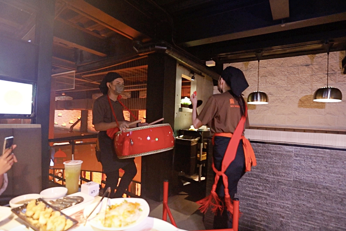 只見一群人敲鑼打鼓小步進場,熱情的喊著:『毛肚毛肚好好吃』扛著巨無霸毛肚來帶桌邊。
