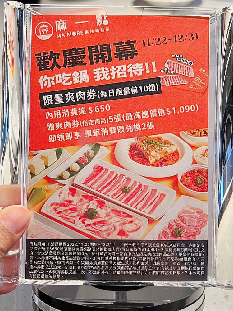 趁著開幕就來搶頭香鼎王集團「麻一點.麻辣喝點茶」,以具有創意的年輕火鍋型態與手搖飲結合,完全擄獲消費者的心,口味上也調整的符合台灣人喜愛,麻辣鍋的麻香豐富,辣度不高,是大眾都能接受的。尤其送巨無霸毛肚的活動,讓用餐的人不只吃的開心也玩的開心,想吃的朋友趕快訂位!
