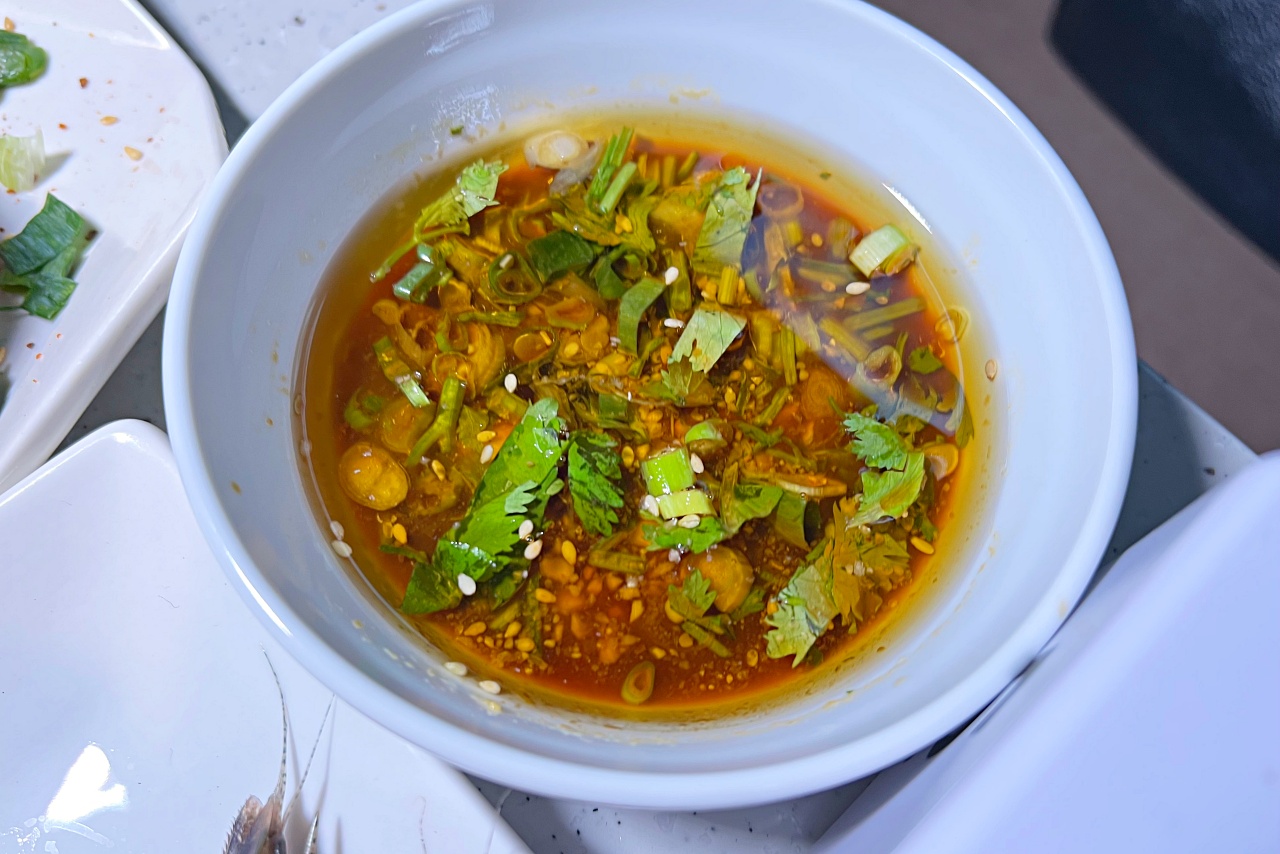 這個交給服務人員就行了,會直接放入麻辣鍋烹煮,等計時器叫的時候再撈上來,淋上特調蠔油麻辣醬一起吃,風味很特別。