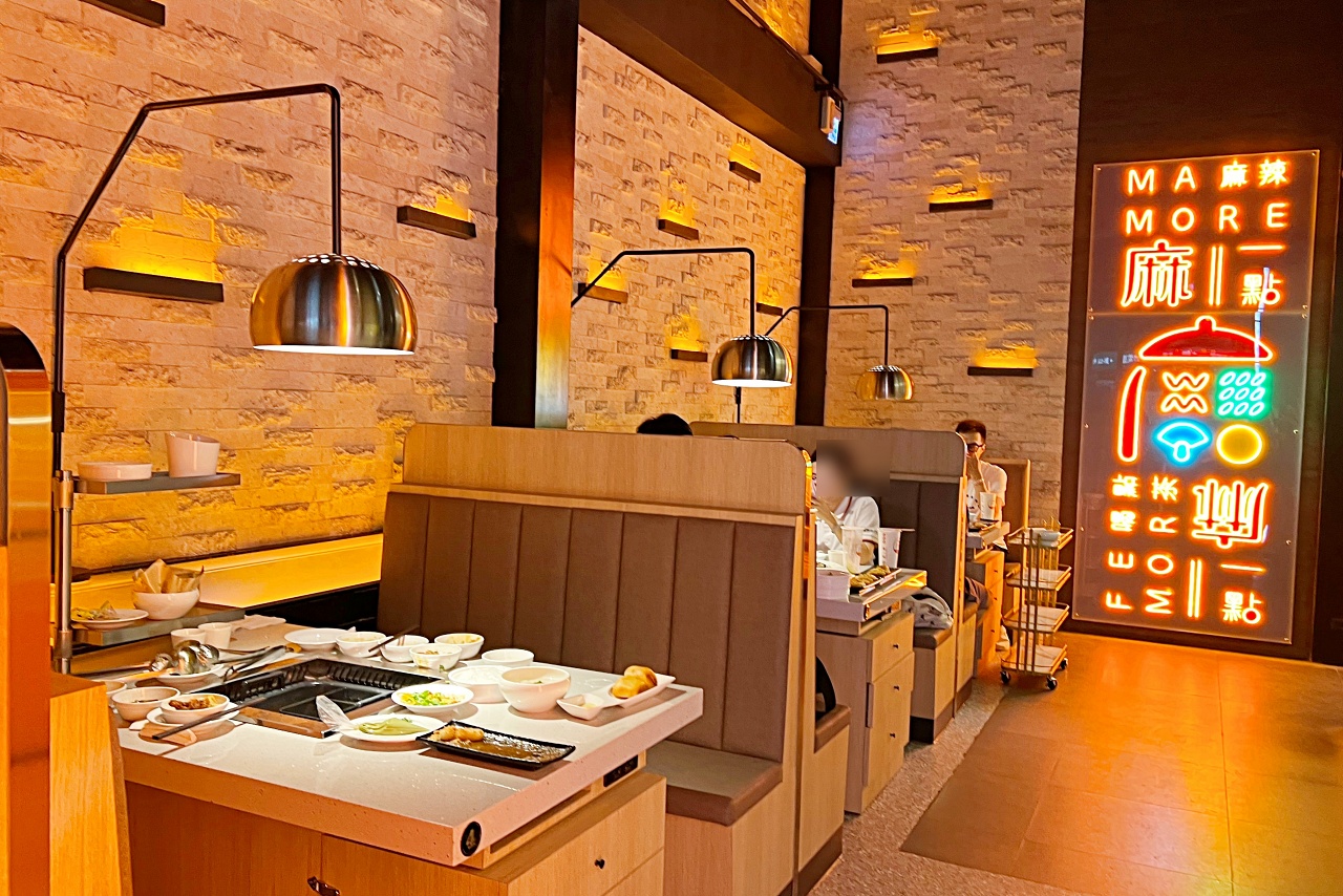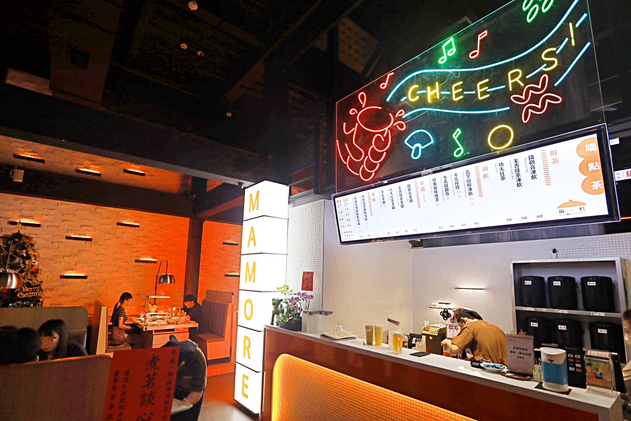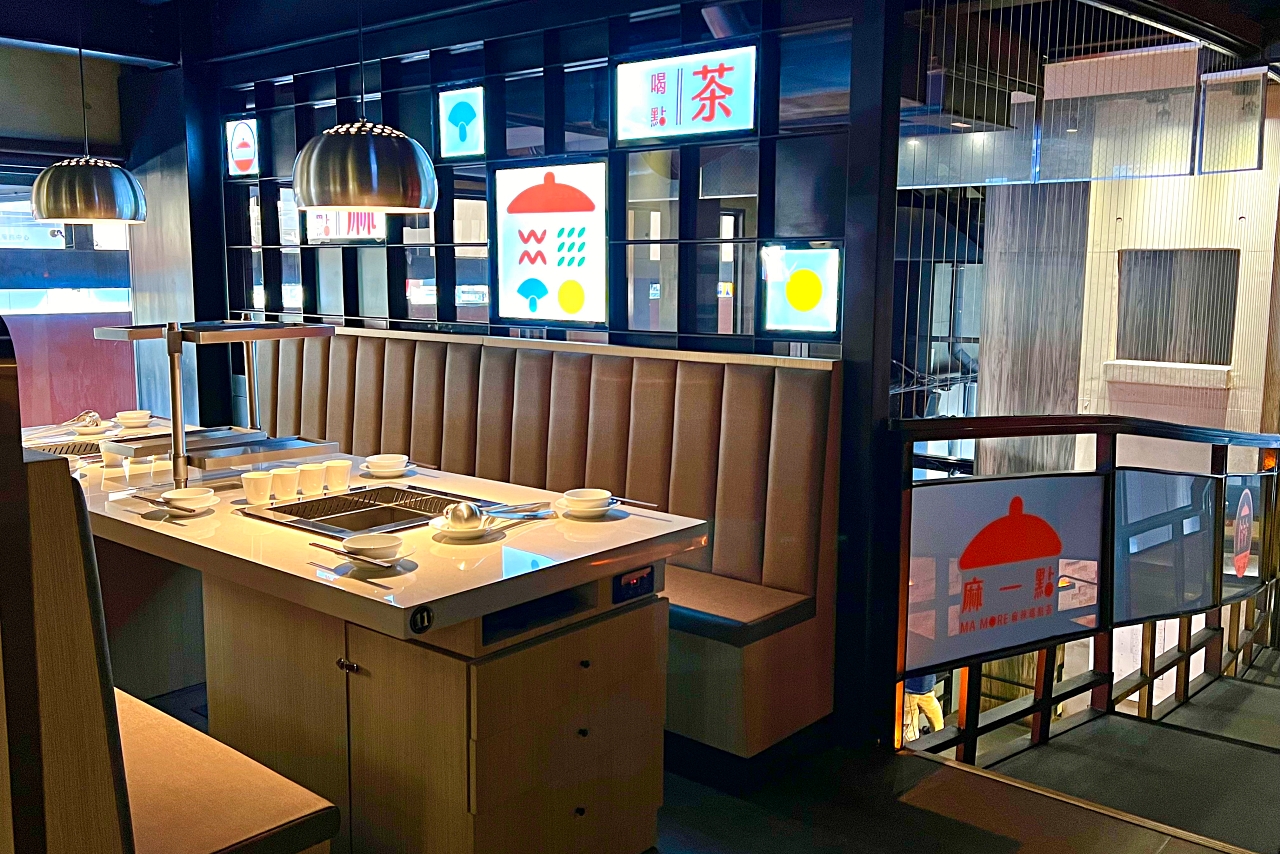 有別於以往集團旗下的「鼎王麻辣鍋」與「無老鍋」,這間「麻一點 」整體風格設計的很年輕,如同它的名字一樣,就是主打麻辣火鍋。最特別的是一開門就看見活潑明亮的手搖飲吧台,還以為來到茶店了,把「麻辣鍋 X 手搖飲」這樣的雙重享受結合起來,一口麻辣鍋一口手搖飲,創新吃法虜獲年輕人的心。