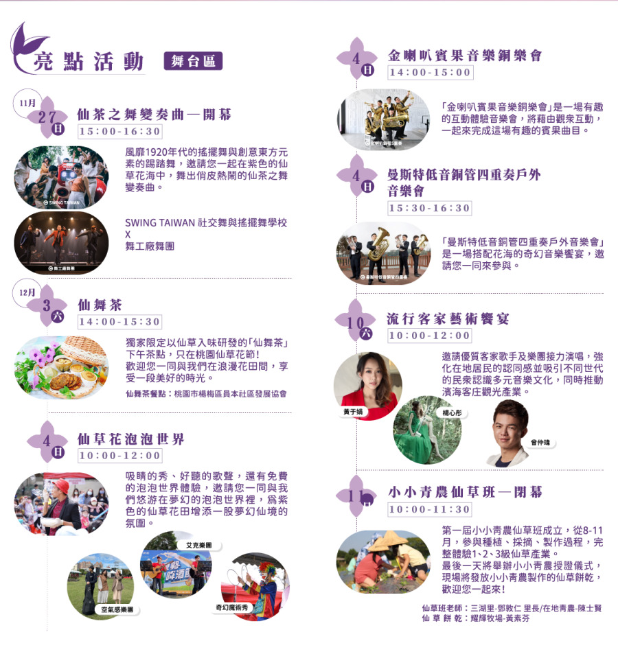「2022桃園仙草花節」緊接在桃園花彩節之後,也是年底壓軸的一大盛事!「2022桃園仙草花節」活動自11/27~12/11共15天,在楊梅休閒農業區盛大展開,都可以免費參觀拍照~這次以「仙茶之舞」為主題,將仙草茶及茶湯意象融入其中,一共規劃五大展區,淡雅紫色的夢幻花海,置身其中彷彿來到普羅旺斯般的迷人,免出國就能拍出絕美異國風情~搭配多項精彩活動、農事體驗、市集、客庄旅行等,還能順遊在地農場,來一趟知性的旅遊也不錯!