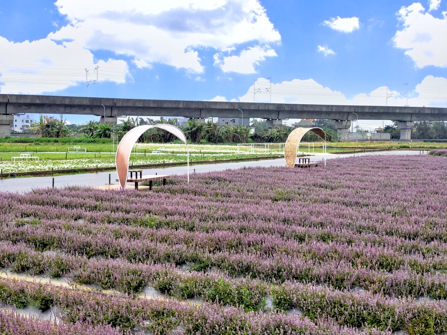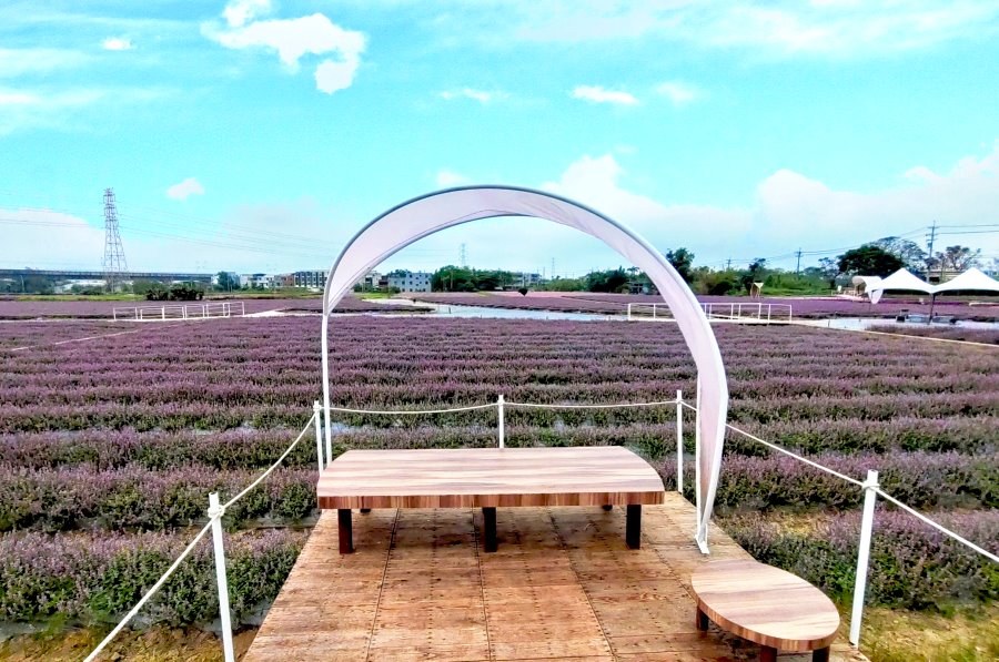 ▼隨風飄揚的一葉仙草,拱起身子做出讓旅人休憩的茶亭,坐在這裡襯著紫色花海拍照也很美~