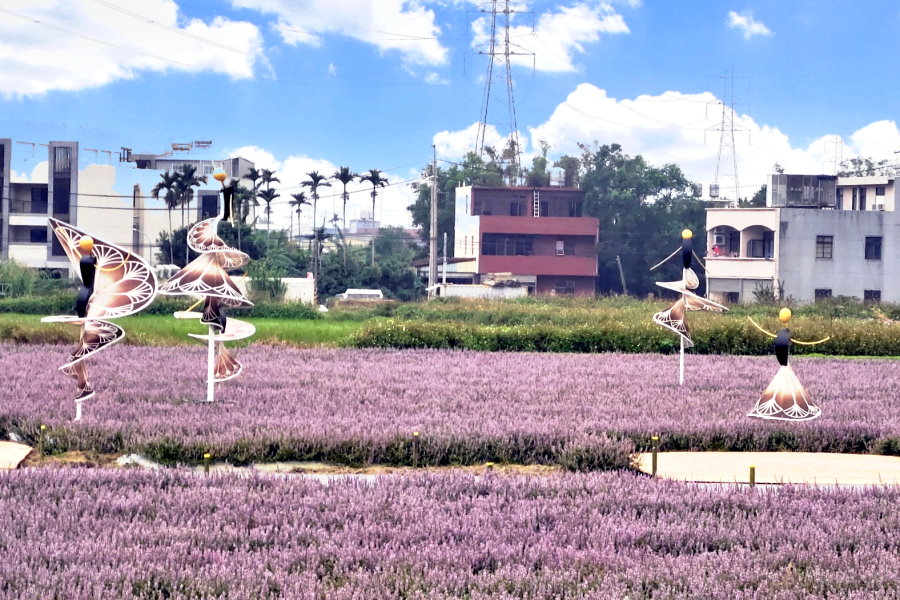 ▼整片紫色花海襯著白色風車,整個超亮眼啊~拍完仙茶韻之後,我們又走到對面的主展區參觀!仙草色我們只有經過但沒拍到,還是介紹一下~以仙草染圖騰旗幟,在花田中飄揚,看起來舒心又自在!
