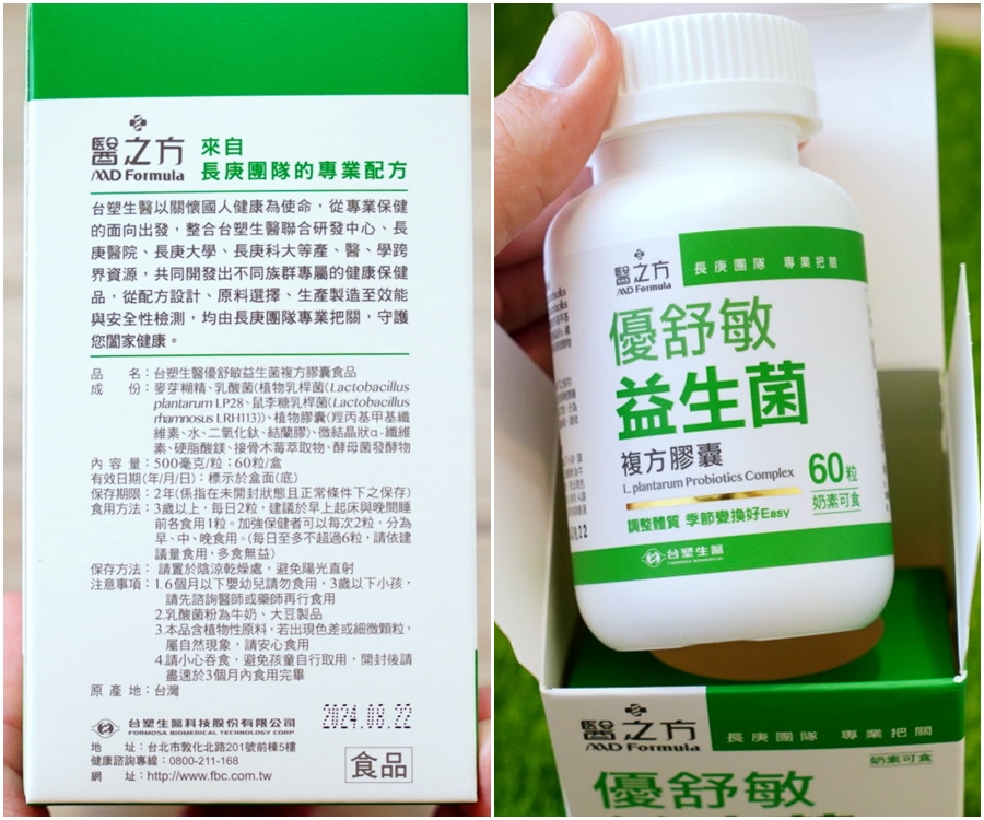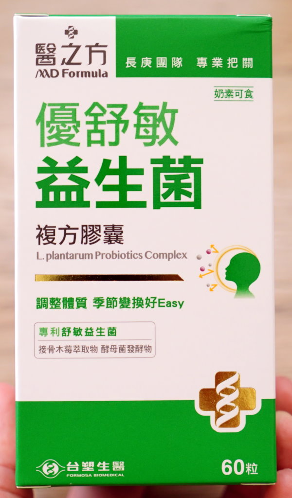 ▼台塑生醫推出的「《醫之方》優舒敏益生菌複方膠囊」主打專利益生菌+酵母菌發酵物+接骨木莓萃取,專利益生菌採全植物性來源專利複合菌種,更適合國人的體質;並採用特殊包埋技術,常溫保存更方便~且能耐胃酸膽鹽,順利抵達體內,定殖力佳!
